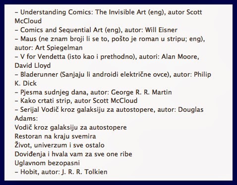 I konačno – Bojan. Bojane, Bojane… Znam da u toj svojoj glavici skrivaš genijalne naslove. Znam zato što sam upravo zbog tvojih preporuka došla do nekih odličnih knjiga za koje inače nikad ne bih čula. Znam da imaš ludnicu od rasporeda, ali isto tako znam i da sam ja zločesto biće i da te moram nekako kazniti. Zato ću ovdje objaviti izmišljen popis tvojih najdražih knjiga. Nadam se da će te to natjerati da pravim popisom demantiraš ovo ovdje napisano. 😛 🙂 Dakle, Bojanove najdraže knjige su: