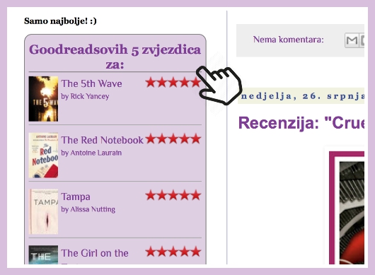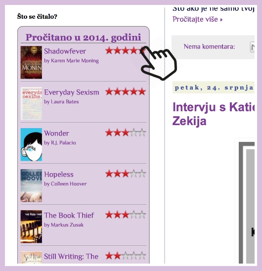 Prije nekoliko dana, u desnom bočnom stupcu mogli ste vidjeti samo Goodreadsov popis knjiga koje sam čitala u prošloj godini. Koga to zanima više? Sada je na prvome mjestu popis knjiga koje sam do sada pročitala u ovoj godini.