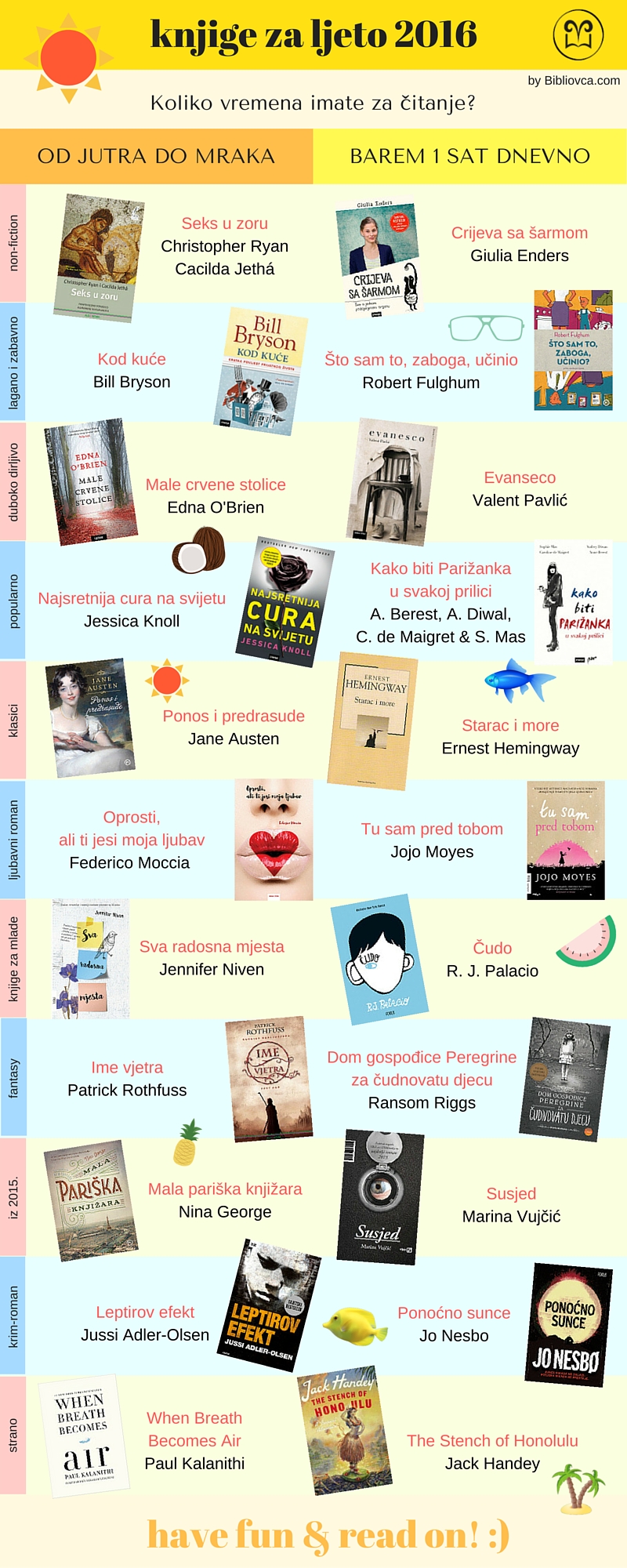 Ovaj dio priprema za ljeto mi nikada ne dosadi – biranje knjiga koje ću ponijeti na odmor! No, bez obzira što svi volimo čitati dok smo na odmoru, mnogi od nas imaju i druga očekivanja i želje koje treba natrpati u tih nekoliko dana predaha. Neki od nas žele samo odvući ručnik na neko osamljeno i mirno mjesto, bez ičije (čak i vlastite) djece na vidiku, i načeti roman koji ćemo čituckati polako, u pauzama između spavanja i hlađenja u moru ili bazenu. Drugi bi vjerojatno htjeli u odmor utrpati još i izlete brodom, šetnje po obližnjim divljim ili uređenim parkovima, koncerte po gradskim trgovima, ali se ipak ne odreći knjige. Kako samu sebe prepoznajem i u jednom i u drugom scenariju, pokušala sam sastaviti popih svojih preporuka tako da one pokriju različite ukuse čitatelja, a istovremeno uzmu u obzir i vrijeme koje za čitanje želimo i možemo na odmoru odvojiti. Nadam se da će vam se svidjeti! 🙂