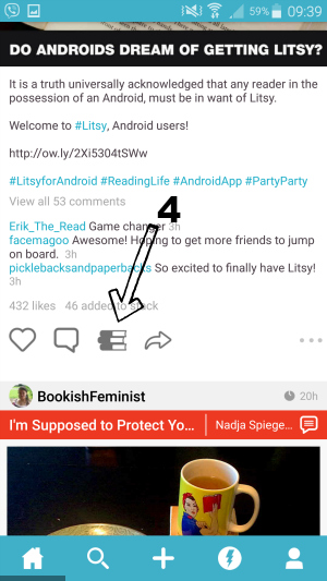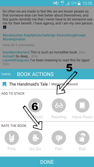 Svaka objava se, kao i na Instagramu, može lajkati (malo srčeko), komentirati (oblačić) i dijeliti (strelica udesno), no ova aplikacija nudi i neke specifične akcije koje podsjećaju na opcije koje nudi Goodreads (5).
