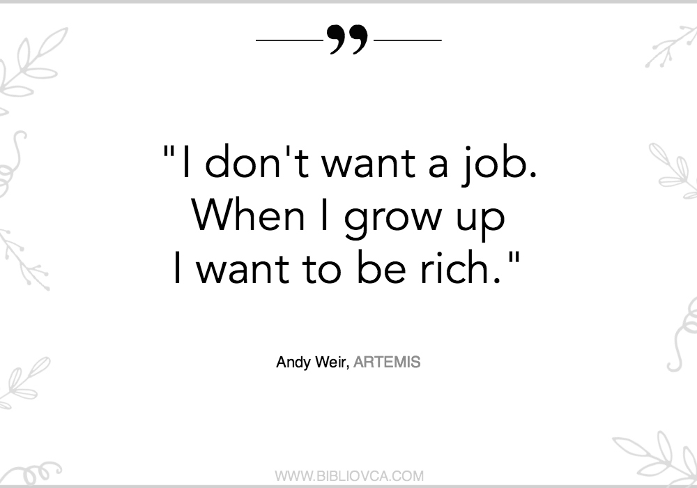 Na Mjesecu postoji čitav mali grad, Artemis, u koji je moguće, ako si dovoljno imućan, sa Zemlje doći u turistički posjet. Svaka vrsta luksuza je imućnom gostu na raspolaganju – što poželi to može i dobiti. Međutim, oni koji posjetiteljima omogućavaju udoban i uzbudljiv boravak na Mjesecu – oni se moraju snalaziti. Koliko ti je na Mjesecu dobro ovisi o tome koliko si pametan, snalažljiv, ambiciozan i koliko se dobro skrivaš od onih koji ne žele da si ti snalažljiv i ambiciozan kada je tvoj vlastiti probitak u pitanju.
