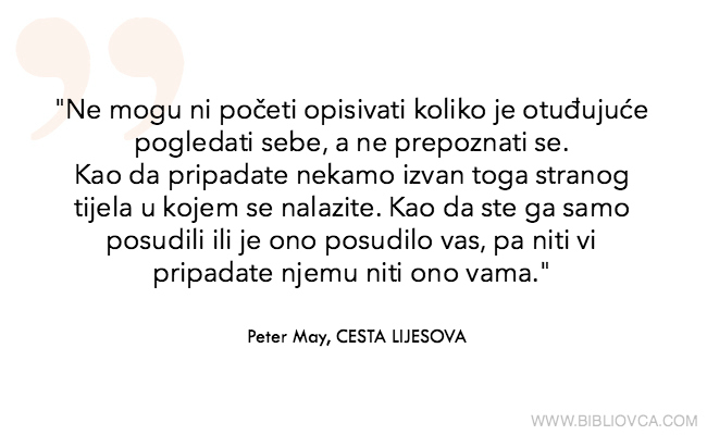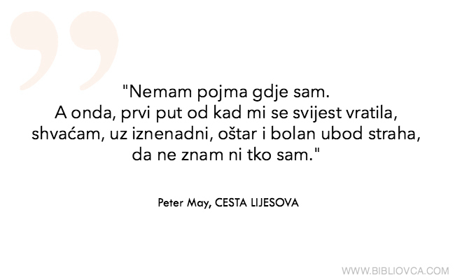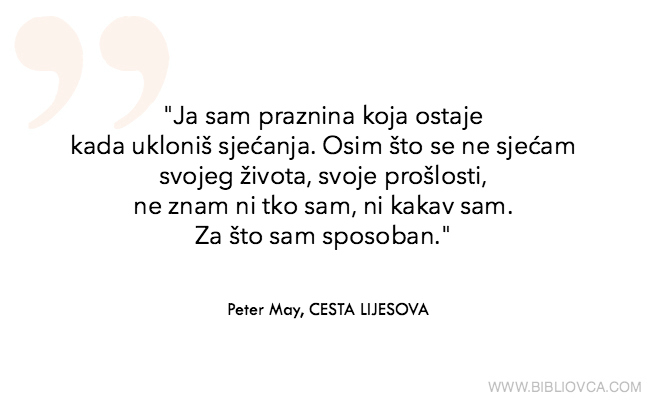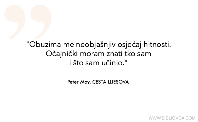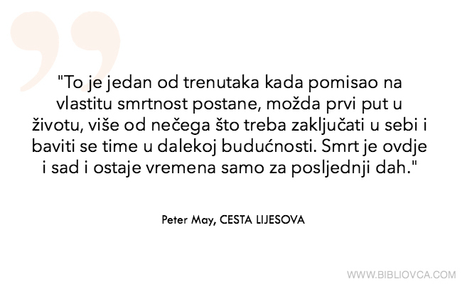 Dok se “Ona prije mene” bavila uskim svijetom poremećenih individualnih odnosa, kraj “Ceste lijesova” razotkrio je poremećene odnose i zaorao po etičkim pitanjima na globalnoj razini koja se tiče svih nas. Osim što je dobrim pripovijedanjem Peter May učinio uslugu čitatelju, izborom teme učinio je uslugu čovjeku kao živom biću i dijelu jednog savršenog, ali osjetljivog ekosustava.