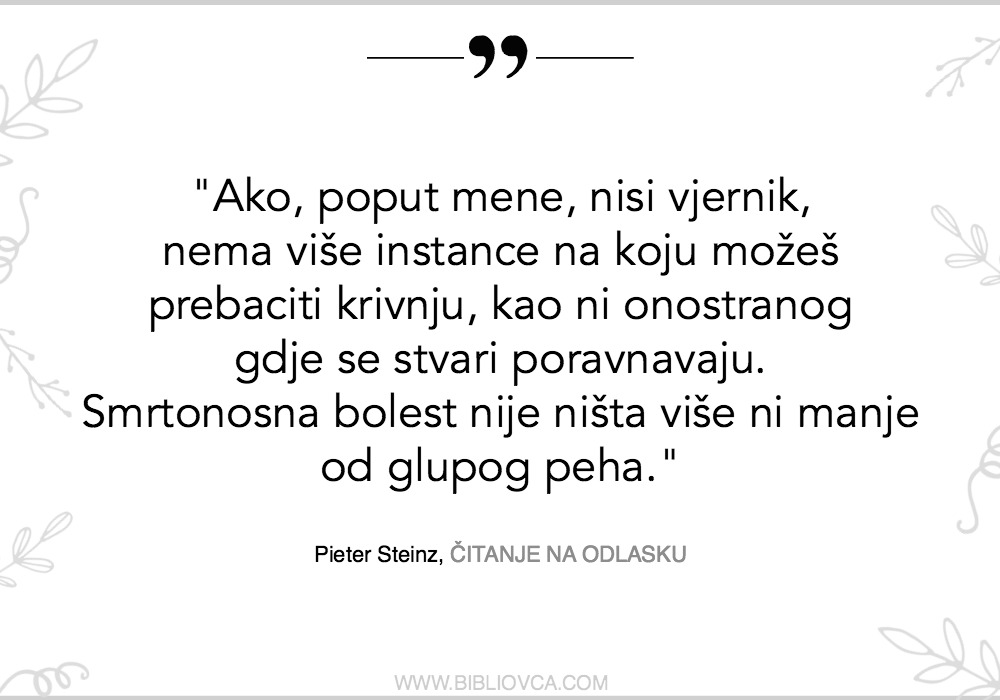 Unatoč tome što je ovu knjigu pisao čovjek koji umire, i još umire trpeći brojne fizičke smetnje i bolne nelagode, i unatoč tome što se knjiga bavi temama koje su ne samo teške, već su mnoge od njih gotovo tabu, Pieter Steinz napisao je zbirku koja je na neki način toliko lagana i optimistična i na pravim mjestima u pravoj mjeri dotaknuta jednim inteligentnim humorom, da ju je zaista bio užitak čitati.