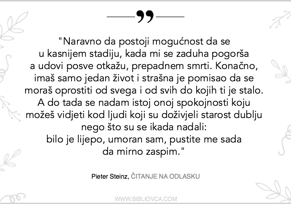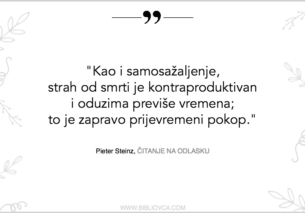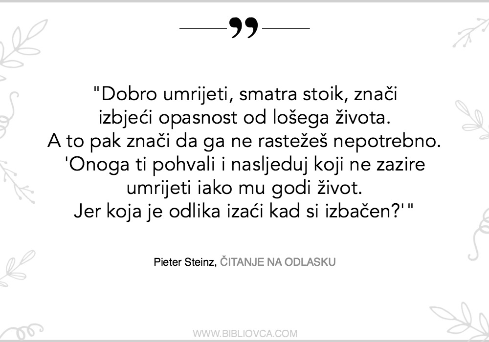 U ovom dijelu me je najviše zadivio: treba hrabrosti kako bi čovjek hrabrio sebe pred nezaustavljivim umiranjem. Svidjelo mi se što je od svih učenja koja su mnoge religije i filozofije nudile kao način razmišljanja o vlastitoj prolaznosti, Pieter Steinz najviše smisla pronalazio u onome što su poučavali stoici.
