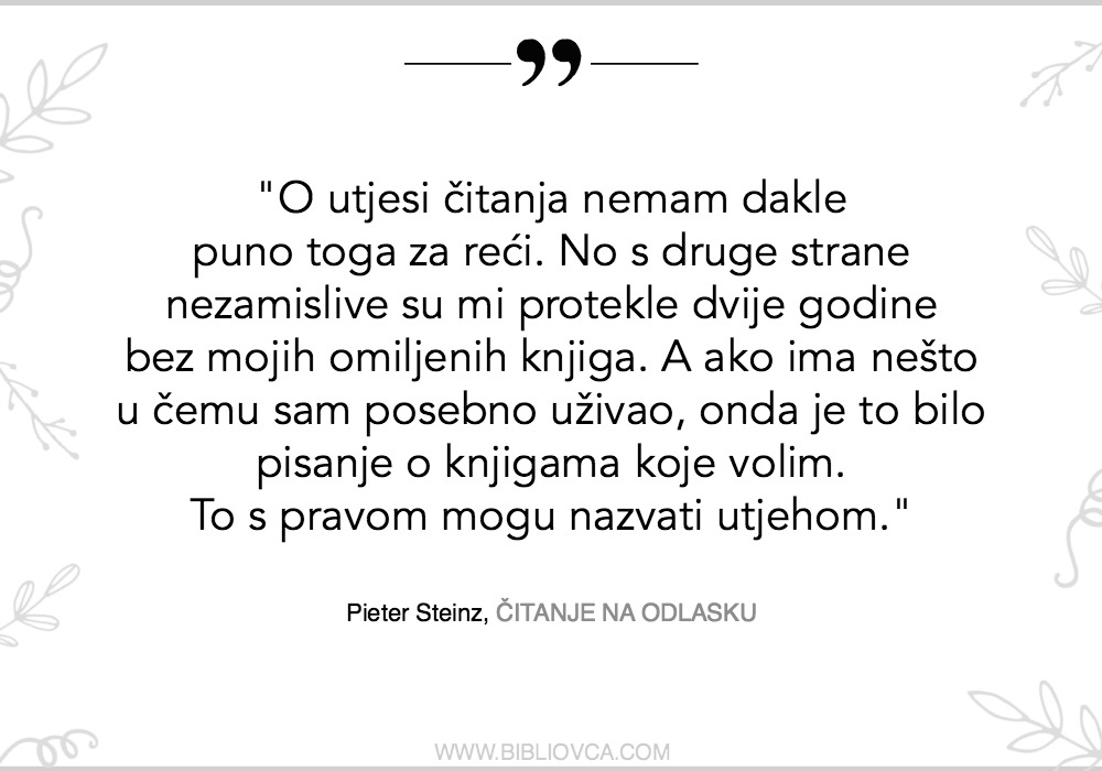 Toliko toga novog sam naučila o knjigama i autorima koje sam već poznavala (ali ne na ovaj način) i toliko toga još želim naučiti; za toliko autora mi je žao što ih nemamo u hrvatskom prijevodu – kako Steinz o njima piše, došlo mi je da nabavim sve te knjige i onda gnjavim svoju kumu da mi ih čita i prevodi.