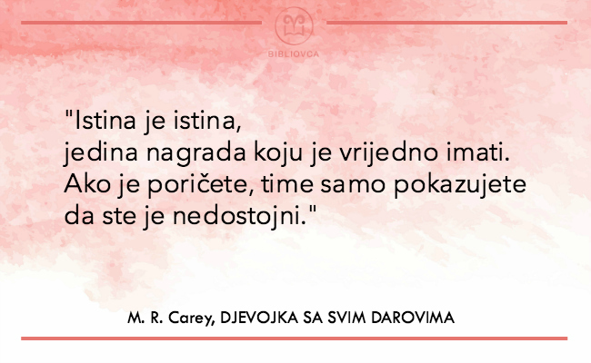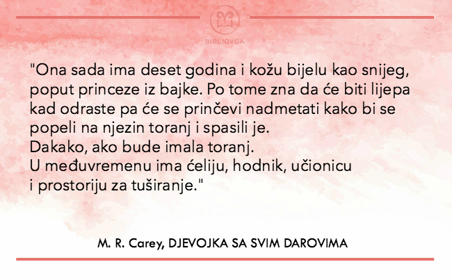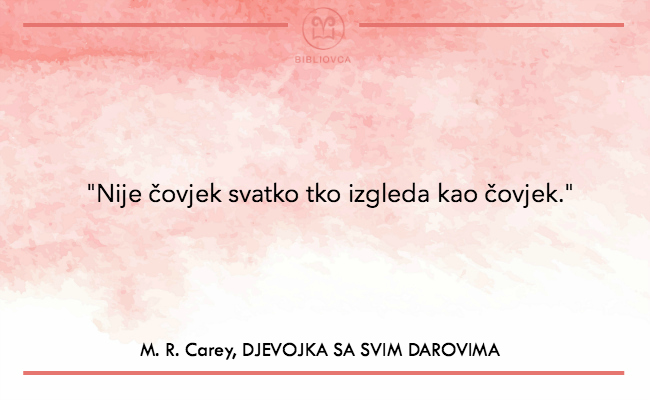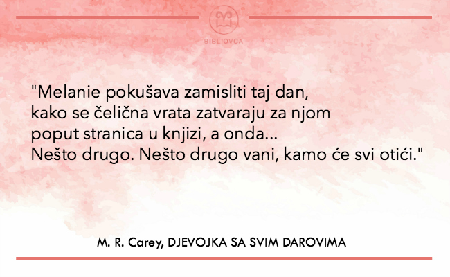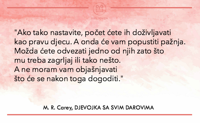 Nemojte mi zamjeriti što vam ne želim reći više. Ne mogu vam reći više. Doslovno ne znam kako bih vam objasnila što sam pročitala. “Djevojka sa svim darovima” je knjiga koja je savršeno uspjela kao žanrovski naslov – distopija podrazumijeva postojanje nečega što je poharalo planet i stanovništvo planeta, nešto što je ugrozilo, možda i trajno, dotadašnji način postojanja i preostala šačica ljudi bori se kako bi preživjela, kako bi ponovno izgradila civilizaciju. No, ova knjiga vas pita – jesmo li zaslužili tu drugu priliku? Jesmo li doista bolji za svijet, za same sebe i za druge oko nas od neke nove vrste (predatorske?) koja bi nas zamijenila?