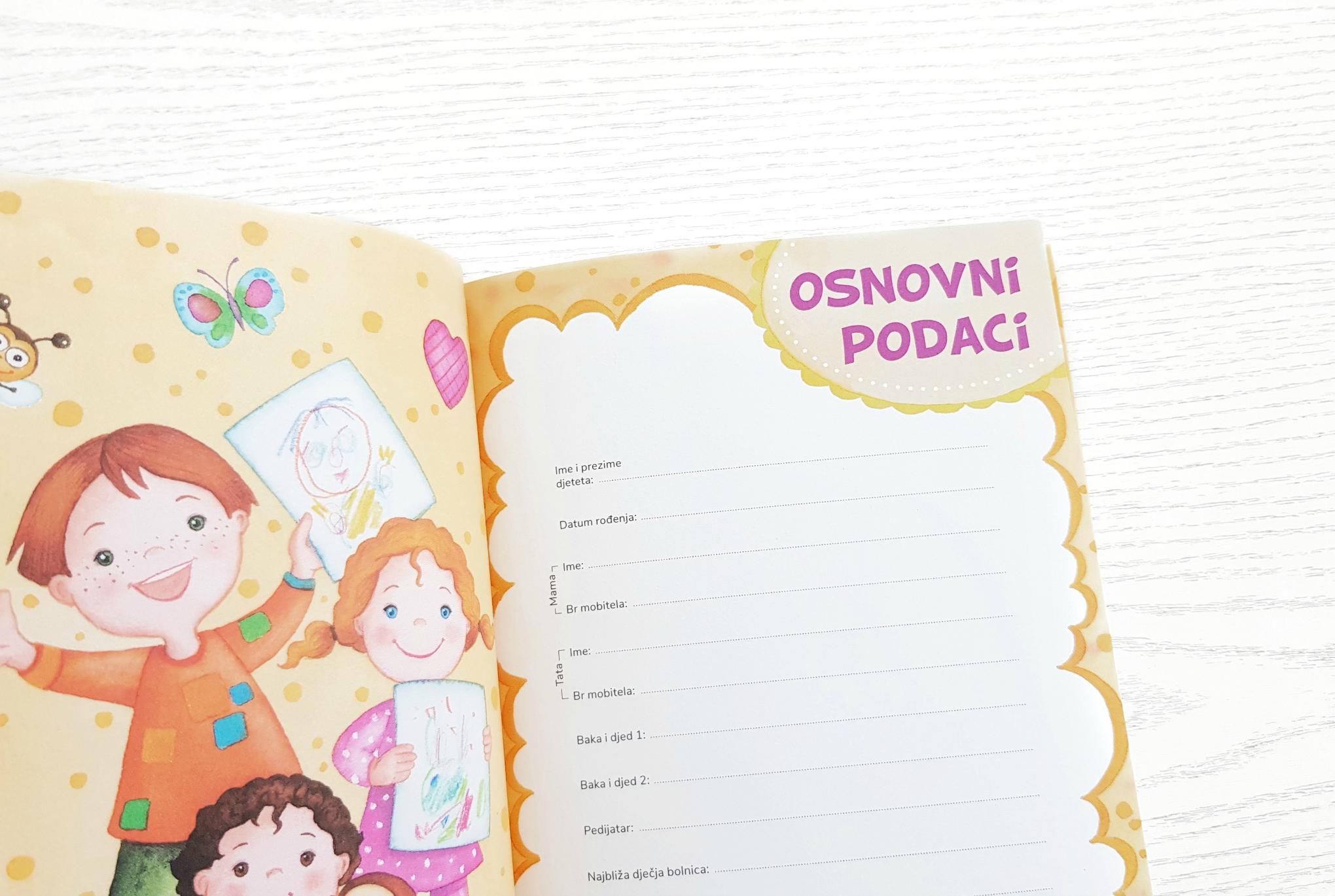 Na samom početku ovog dnevnika nalazi se čitava jedna stranica u koju se mogu upisati “Osnovni podaci” o djetetu – tko su mu mama i tata, na koji broj telefona ih se može dobiti, koje alergije dijete možda ima, kako mu se zove pedijatar, koja mu je najdraža pjesmica, kako se uspavljuje i sl.