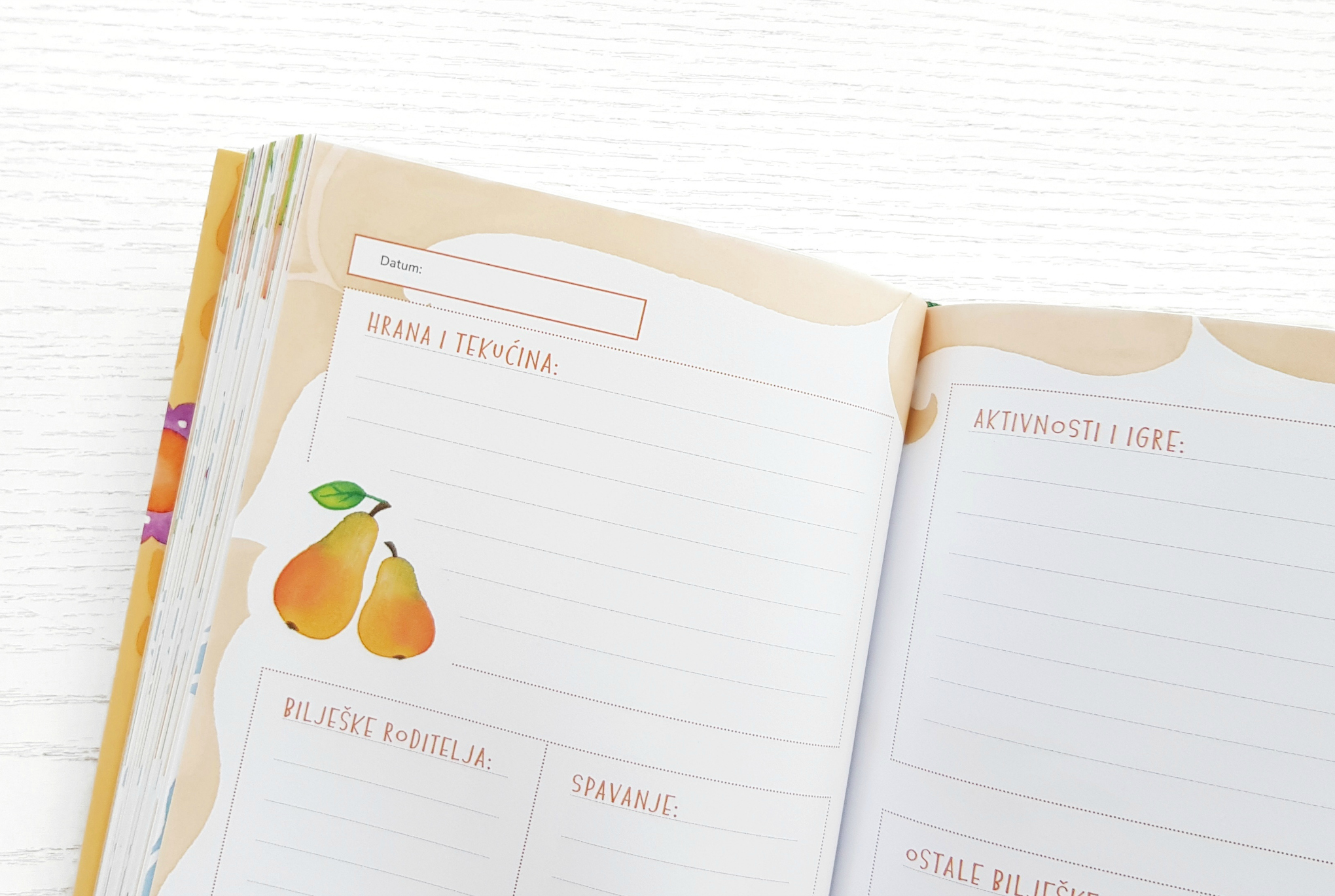 Većinu dnevnika nakon toga sačinjavaju različito ilustrirane stranice na kojima će vas, kad ih otvorite, dočekati rubrika za datum, a zatim šest kvadratića u koje ćete moći bilježiti što je dijete tog dana jelo i pilo, čime se igralo i što je naučilo, kako je i koliko spavalo, itd.