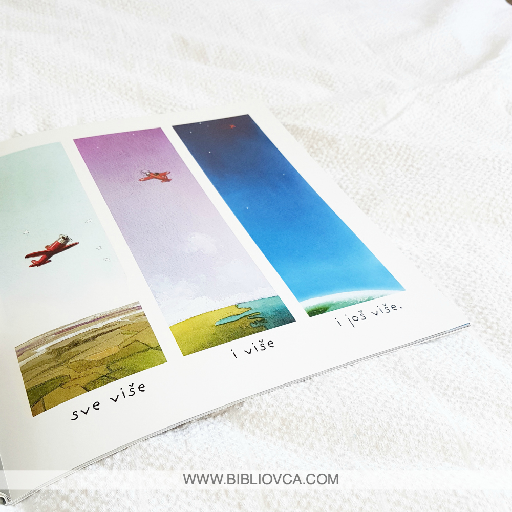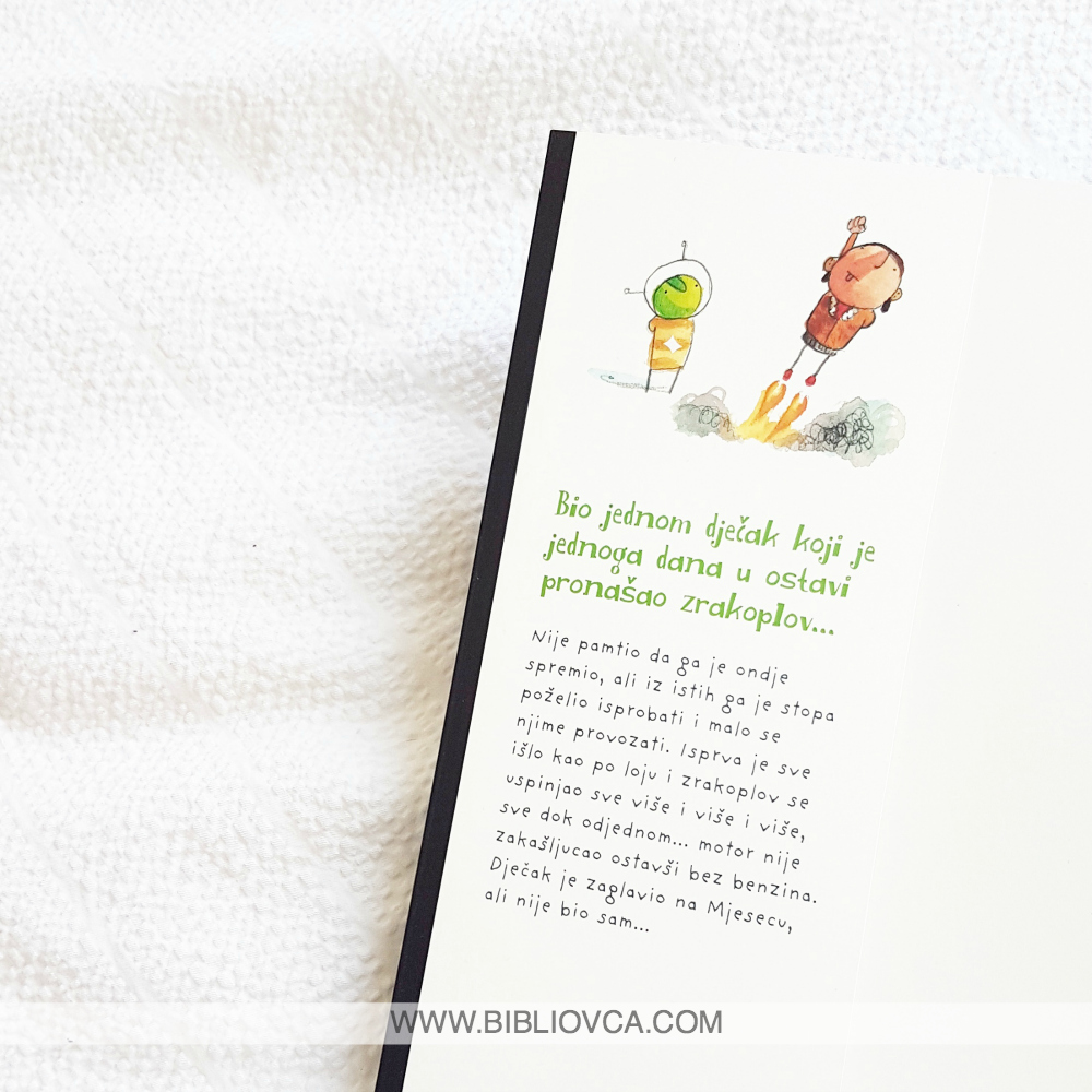 Ja sam sa svojim djetetom u onih desetak pokušaja čitanja ove slikovnice uspjela stići negdje do pola. Prvo mu koncentracija pukne negdje na prizorima aviona i počne sa: “Mama, crtati avion! Mama, idemo!”, a ako uspješno prođemo taj dio, onda i mi zapnemo na Mjesecu. Mjesec je divan. Mjesec ga očarava. I on se, kao i dječak, sjeti da je baš fora uzeti ručnu svjetiljku i mahati snopom svjetla okolo. Opraštam mu jer ima tek dvije godine, ali sam sigurna da bi nekom starijem djetetu i ostatak priče bio zabavan, smiješan i poučan.