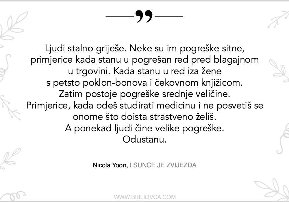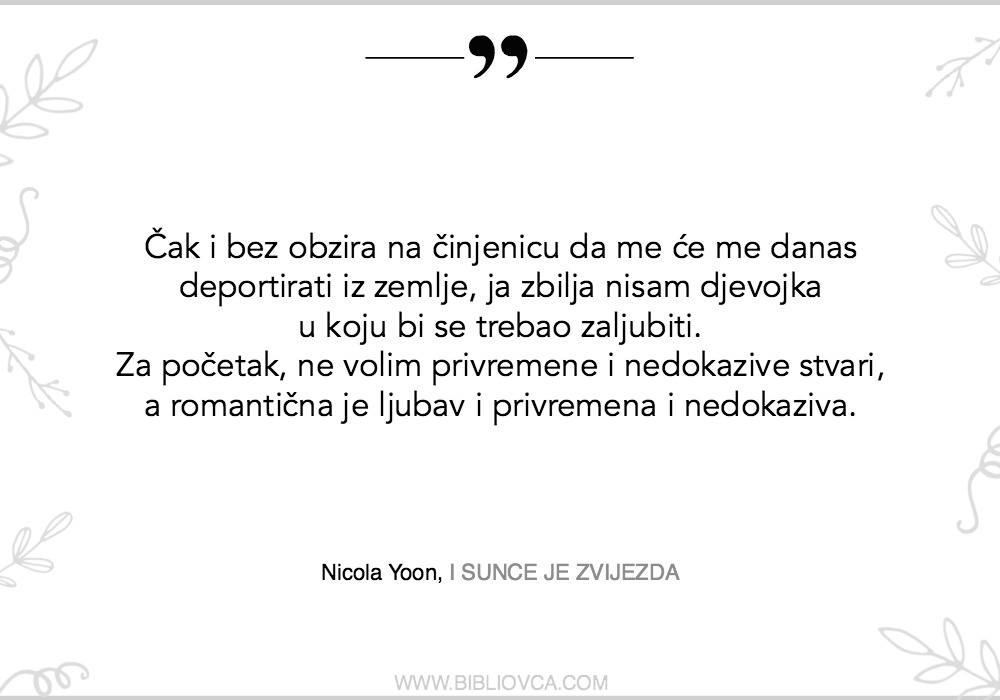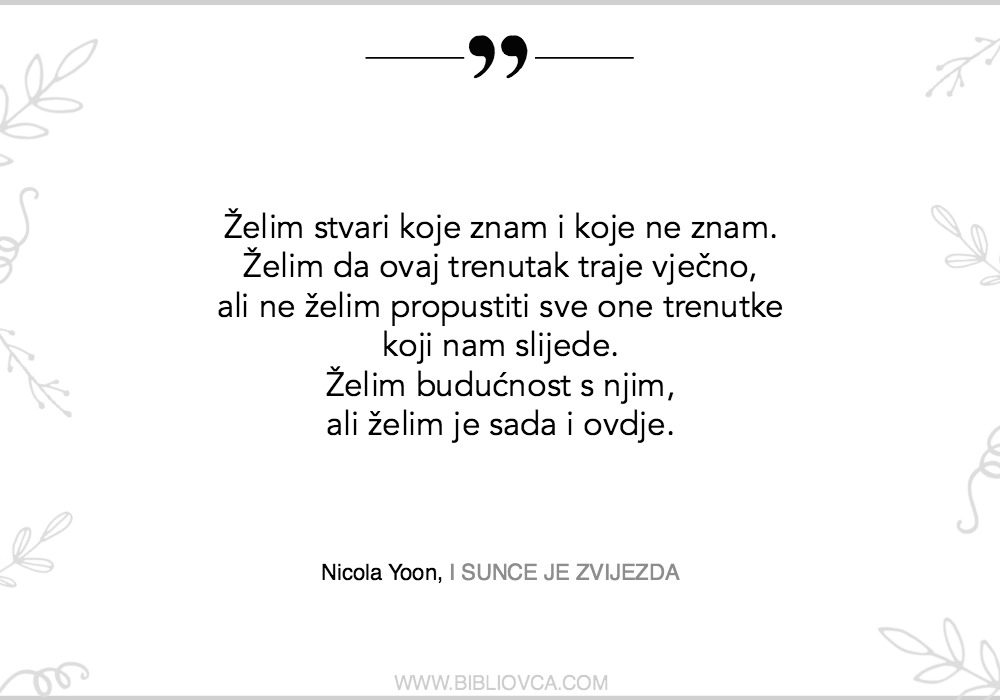 Sigurna sam da ćete uživati u knjigama Nicole Yoon, a ja sam sigurna da ću uživati i u filmu po ovoj knjizi; ispadaju mi oči svaki put kad vidim glumca koji glumi Daniela… *je, grozna sam i svjesna svojih godina*
