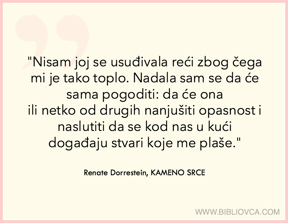 Renate Dorrestein će vam pripovijedati o jednoj važnoj temi iz Ellenine sadašnjosti i Ellenine prošlosti, a način na koji piše onemogućava ikome od nas koji smo knjigu pročitali da vam je predstavimo ili prepričamo. Proces spoznavanja kako radnje tako i glavne teme koju njome problematizira, zahtijeva od čitatelja najizravniji i najintimniji mogući kontakt s tekstom. Idealno, onaj bez posrednika. Ja sam se kao bloger tu ugurala pišući svoj osvrt o ovoj knjizi, ali nastojala sam napraviti što manje štete.