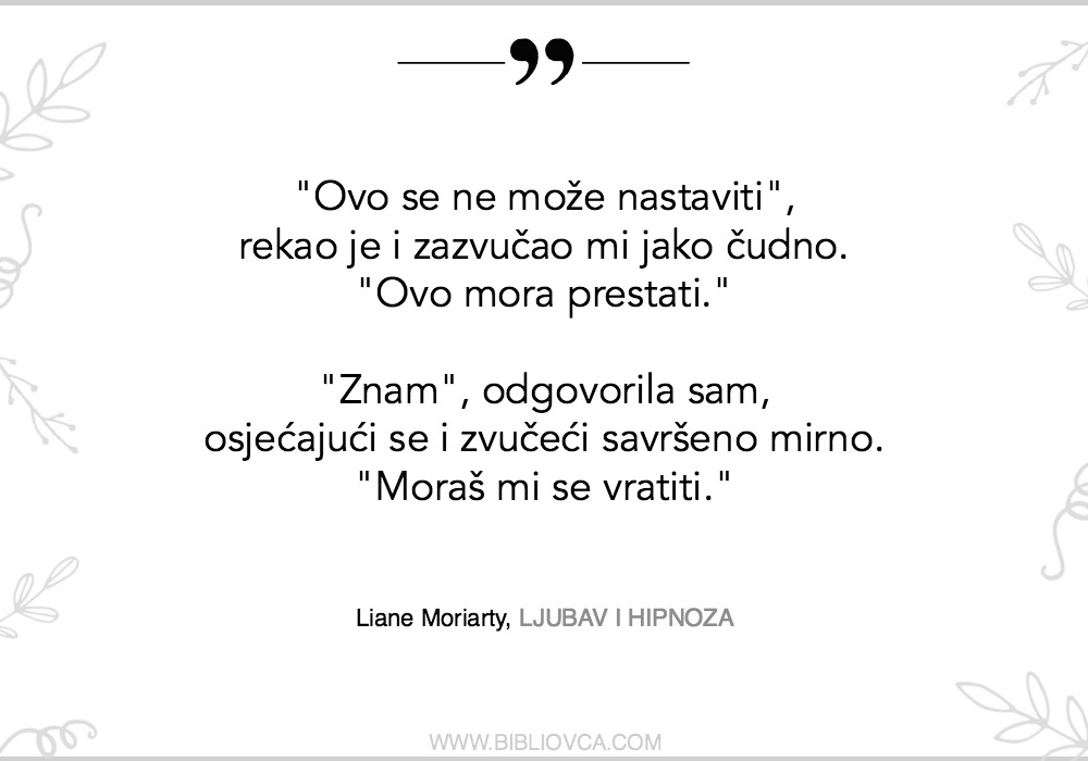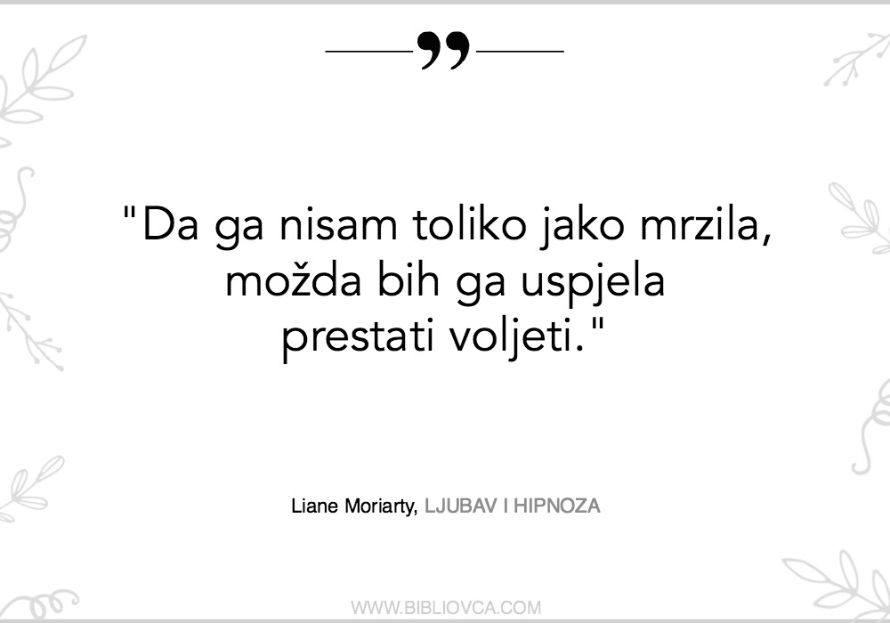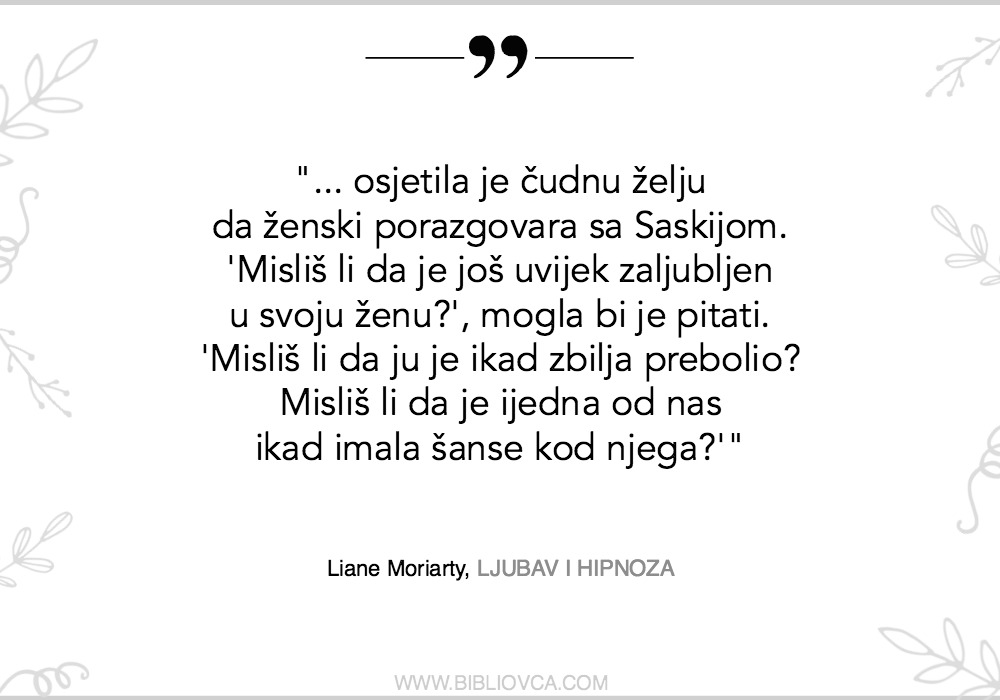 Ono što je meni bilo najzabavnije u knjizi je to da bih vam mogla izvući komade teksta koji sadrže Ellenine i Saskijine unutarnje monologe i da biste sigurno počinili mnogo pogrešaka kada biste ih morali razvrstati u dvije hrpe. 🙂 Zgodan trik gospođe Moriarty; s jedne strane imamo hipnoterapeuta, nekoga čiji bi unutarnji monolozi trebali blistati od mentalnog zdravlja, a zateknemo se kako se čudimo i njenim razmišljanjima i njenim potezima; s druge strane imamo bivšu djevojku koja ne može prestati s jednim patološkim ponašanjem, ali njena objašnjenja nam zvuče tako zdravorazumski da bismo s njom počeli u potpunosti suosjećati, samo da nema tih njenih poteza zbog kojih nam trnci zaplešu po vratu. 🙂 Jako zgodno.