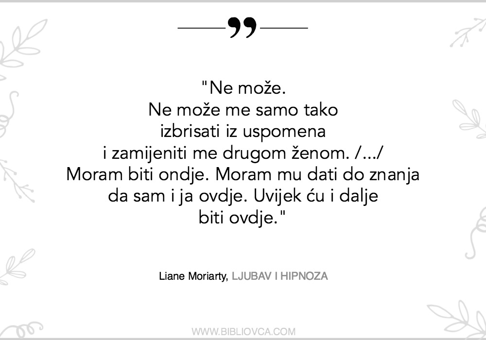 Knjiga ima mnogo veseliji ton od “Suprugove tajne” i nešto mi je razvodnjenija kada je u pitanju napetost i neizvjesnost. Voljela bih pročitati i sve njene ostale knjige, pa da ovoj knjizi, barem u svojoj glavi, dodijelim pripadajući rang.