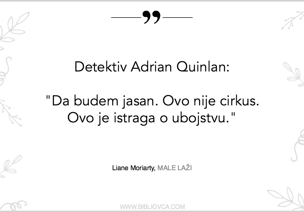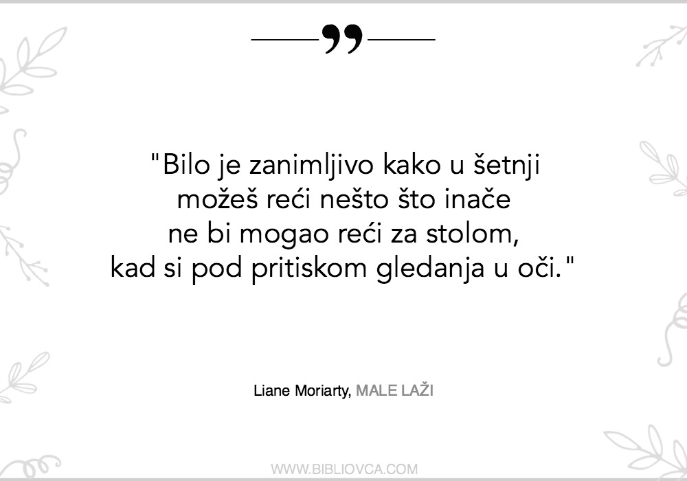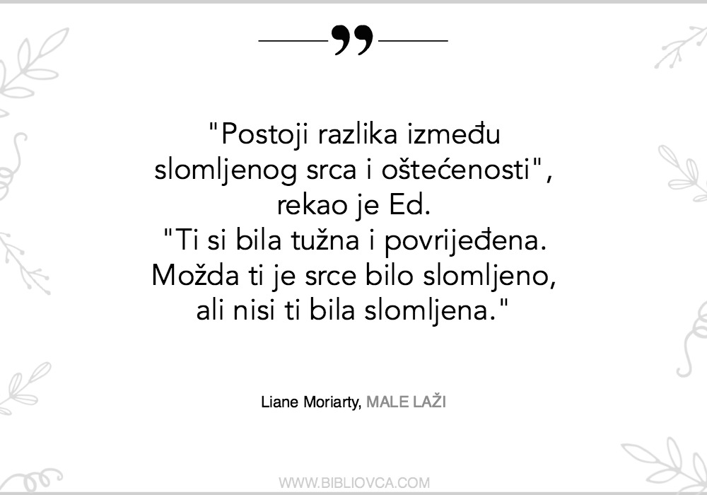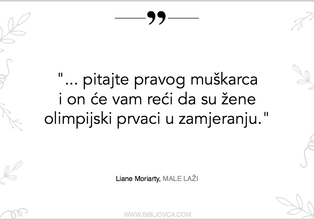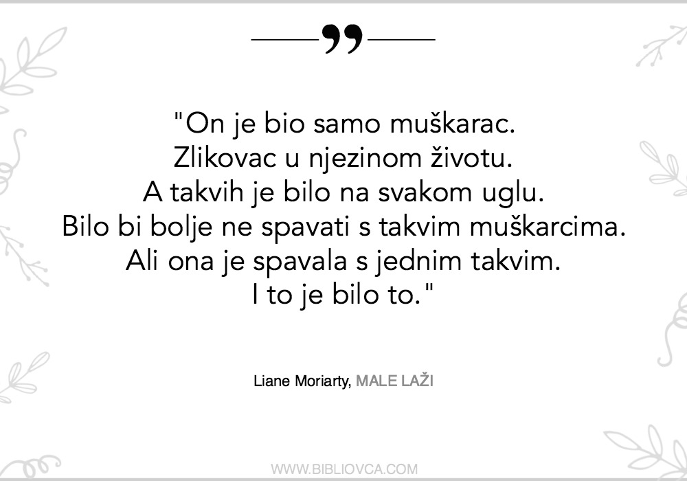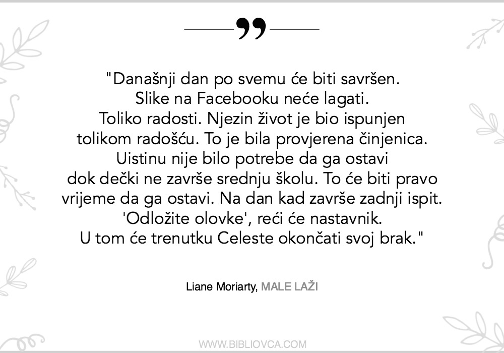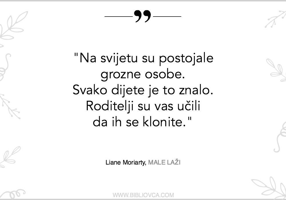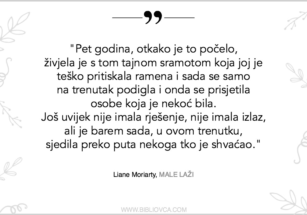 Ovo je treća knjiga Liane Moriarty, i meni i mome blogu. 🙂 Zaljubila sam se u ovu autoricu čitajući “Suprugovu tajnu”, nešto malo manje oduševljenu me je ostavila “Ljubav i hipnoza”, no ova knjiga mi je samo potvrdila da smo svi mi naišli na čudesnu pripovjedačicu.