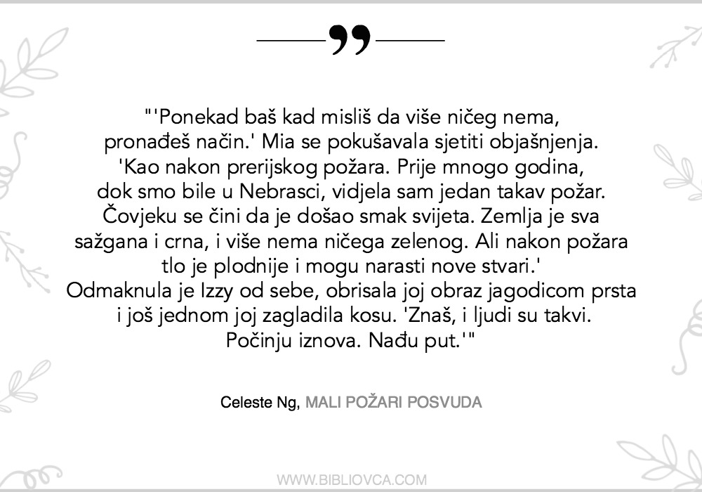 Bojim se samo da je, s obizorm na ozbiljnost teme, a u službi svoje priče, napravila puno propusta u istraživanju pravnih posljedica nekih svojih (meni jako dragih) likova. Bojim se da bi u stvarnosti likovi koje je Celeste Ng prikazala gotovo kao heroje bili tek kriminalci i njihovi suučesnici.