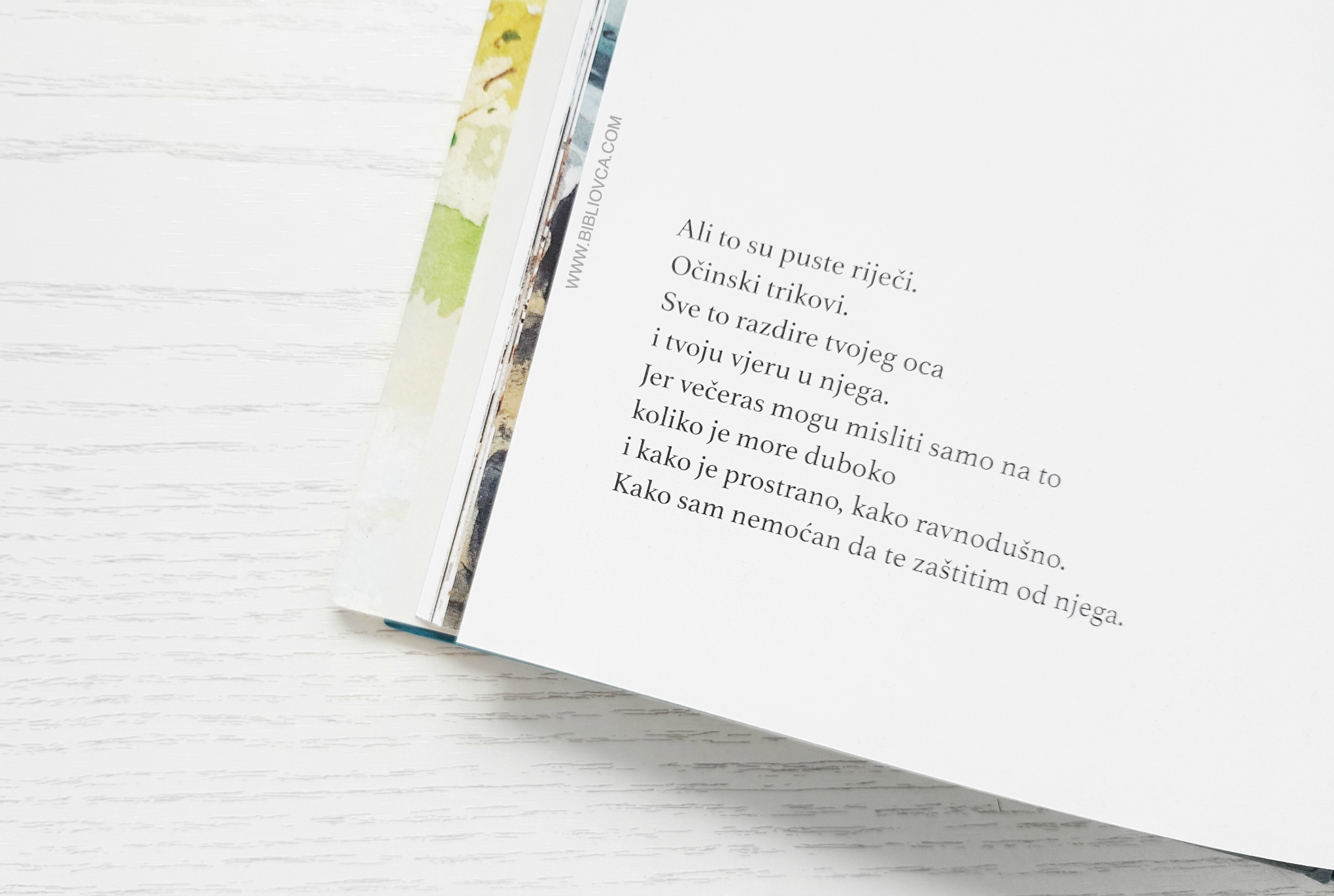 Zato otac i moli – ne više nebo ili bilo kojeg boga; on moli more. Moli more da shvati kakvu dragocjenost prenosi; moli more da pogleda koliko tuge, patnje, straha je već živjelo u tim malenim očima i da pogleda s koliko mekane i tople nade je otac svojim pričama o boljem svijetu obložio to maleno srce koje u njegovom naručju kuca.
