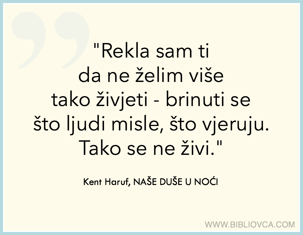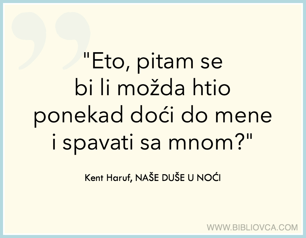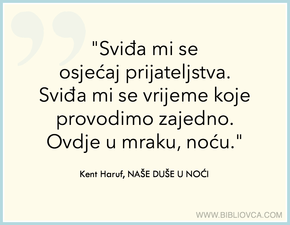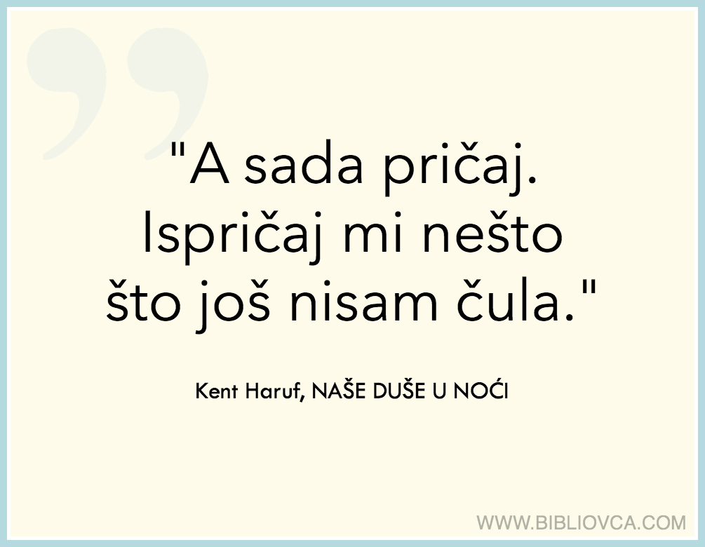 Nevjerojatno je koliko boli može proizaći iz jednog takvog nerazumijevanja, iz jedne nespremnosti okoline da odraslim, zrelim pojedincima, koji su društvu već dali sve što su mogli i koji mu ništa više nisu dužni, dade slobodu da s nekim drugim, sasvm sporazumno, izgradi odnos savršeno skrojen po mjeri dvije duše koje se sastaju u noći i – pričaju.