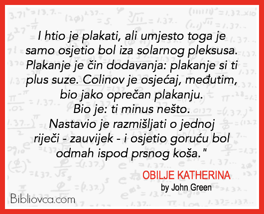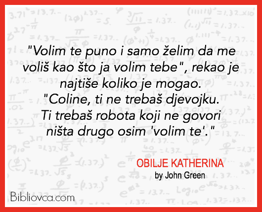 Colin vam može odgovoriti na puno pitanja. Primjerice, koja je to francuska riječ koja označava miris koji iza sebe ostavlja onaj tko je otišao. Može vam brzinom munje reći može li se neka riječ presložiti u anagram. Može s vama razgovarati na nekoliko stranih jezika i opskrbiti vas bilo kakvom, prosječnom čovjeku nepoznatom, povijesnom činjenicom. No, Colin ne bi mogao ni sebi ni vama objasniti kako je statistički moguće da su sve njegove djevojke bile Katherine. I da su ga sve redom ostavile.