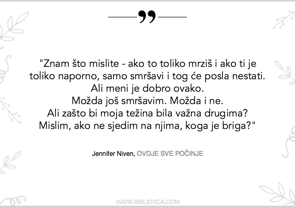 Ako vam se knjiga “Sva radosna mjesta” svidjela zbog toga što se dotiče jedne teme o kojoj ljudi teško povedu razgovor, a i teško se u povedene razgovore uključuju, onda će vam se “Ovdje sve počinje” svidjeti. Pitanje debljine, ljepote, vanjskog izgleda, fizičke privlačnosti je ono pitanje na koje najradije odgovaramo uvježbanim odgovorima koji samo zvuče zrelo i plemenito, ali, dala bih se kladiti, ne odražavaju uopće naša promišljanja i stvarne stavove o ovoj temi.