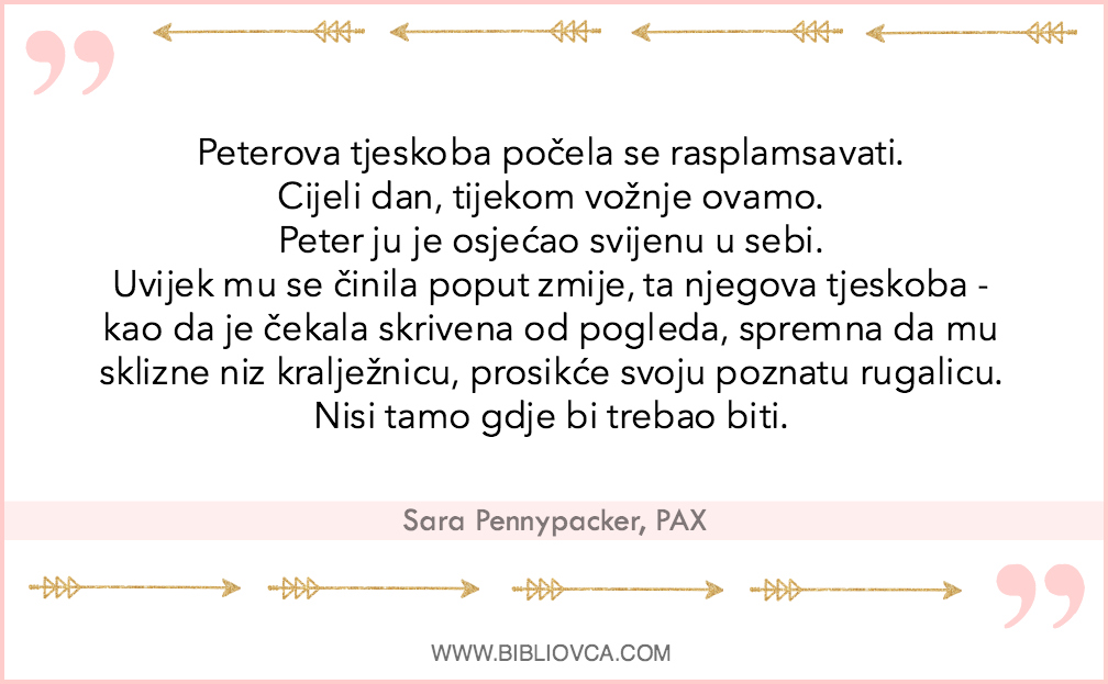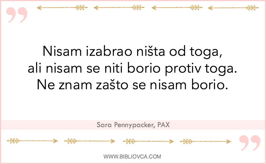 “Jutarnji zrak pulsirao je zvucima proljeća. TIjekom duge prošle noći plašili su Paxa. Tama je podrhtavala mreškanjem noćnih vrebača, a čak i zvukovi stabala – svijanje lišća, smola koja se probija kroz mlado drvo, jedva primjetno pucketanje debla koje se širi – svaki bi ga put prenuli dok je čekao da se Peter vrati. Konačno, kada je nebo postalo srebrno od zore, zaspao je drhtavim snom.”