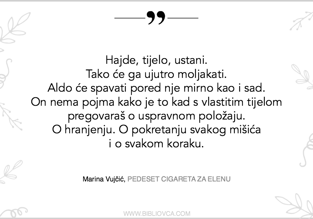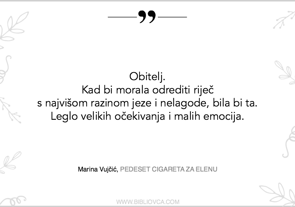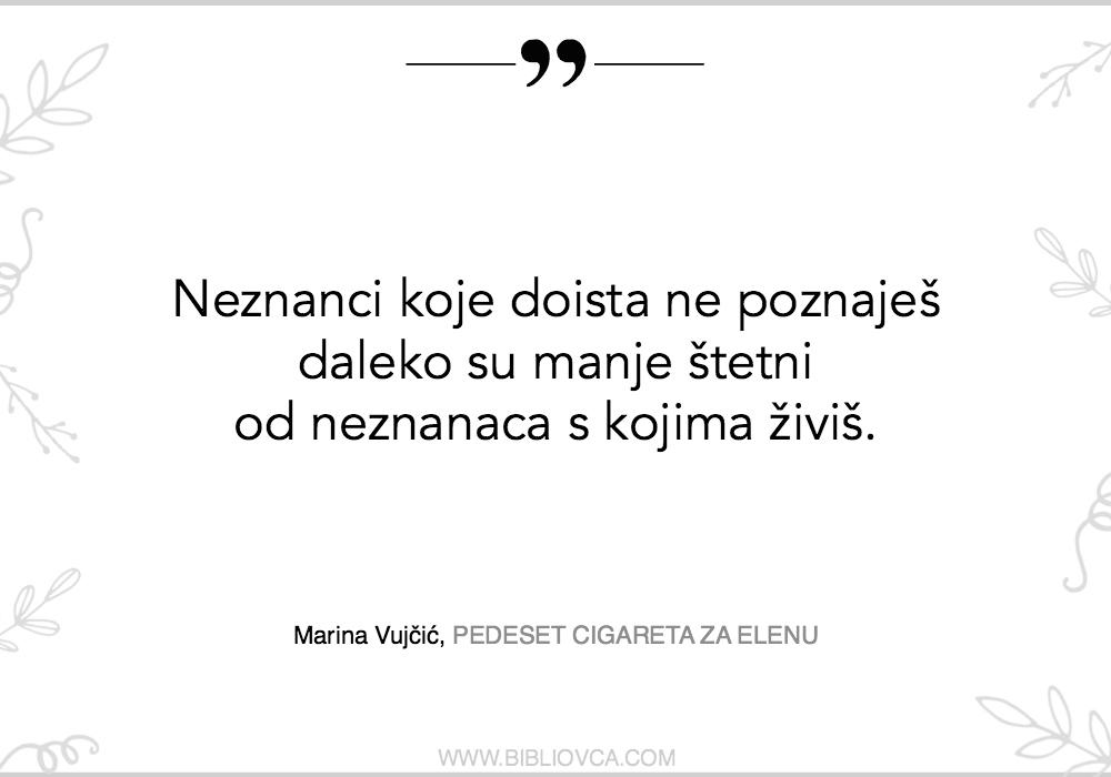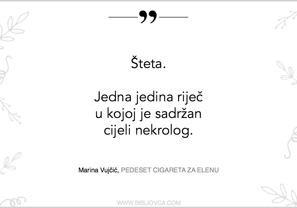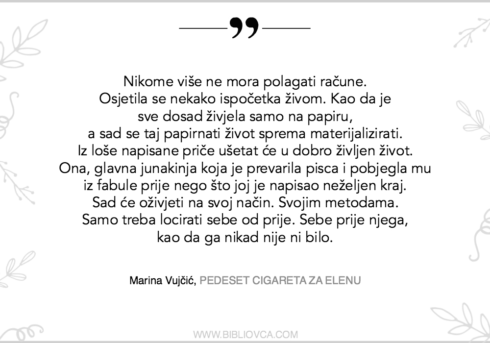 Marina Vujčić je napisala roman koji me je ostavio nijemu od oduševljenja i iznova – još odanije, još složenije, još zadivljenije – zaljubljenu u ovu divnu ženu i autoricu. Rekla sam joj bezobrazno (kao da se nečije stvaranje ima ravnati prema meni) da ne želim više nikada čitati ništa ispod ovoga; “Pedeset cigareta za Elenu” je postavila nove kriterije izvrnosti pripovjedačima u Hrvatskoj. Taj drski komentar bio je tek jedan kompliment zamotan u šalu, ali uručen s gladnom nadom da je ovo Marina koje ću se još načitati.