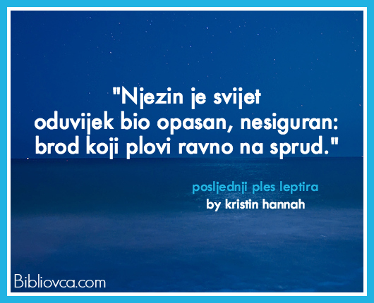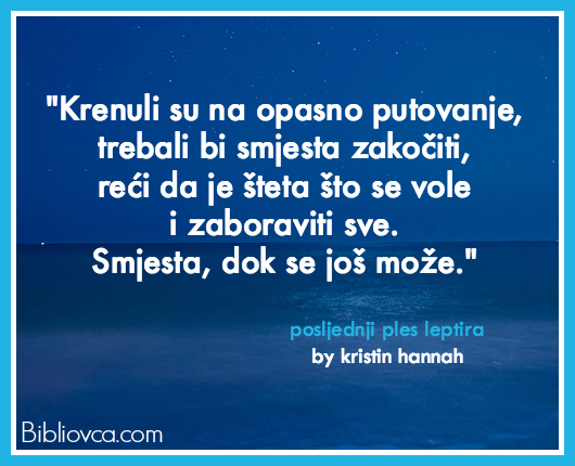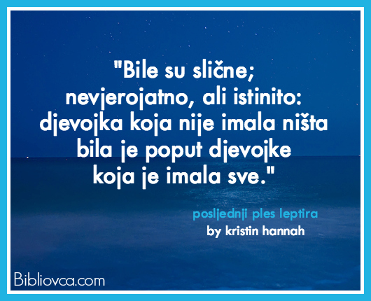 Kristin Hannah je spisateljica koja me definitivno osvojila. Njen stil pisanja je besprijekoran. Način na koji opisuje likove i dinamiku njihovih odnosa je zaista sjajan. Čitajući ovu priču osjećala sam se kao da sam na utrci emocija. Ostala sam bez daha. Gotovo sam ostala i bez suza… Izuzetna je to priča o prijateljstvu, ljubavi, gubitku i iskupljenju. Istražuje posljedice jedne glupe odluke. Priča je to o sazrijevanju, ali i važnosti oprosta.