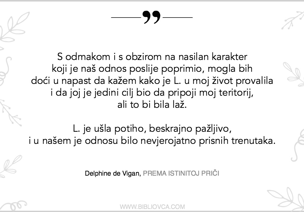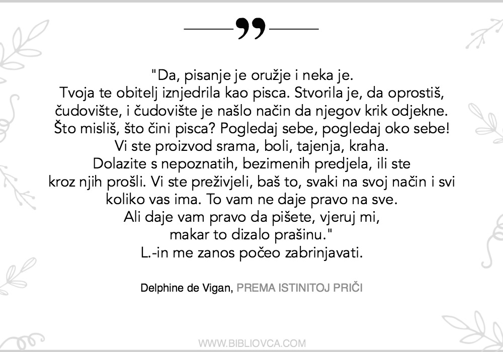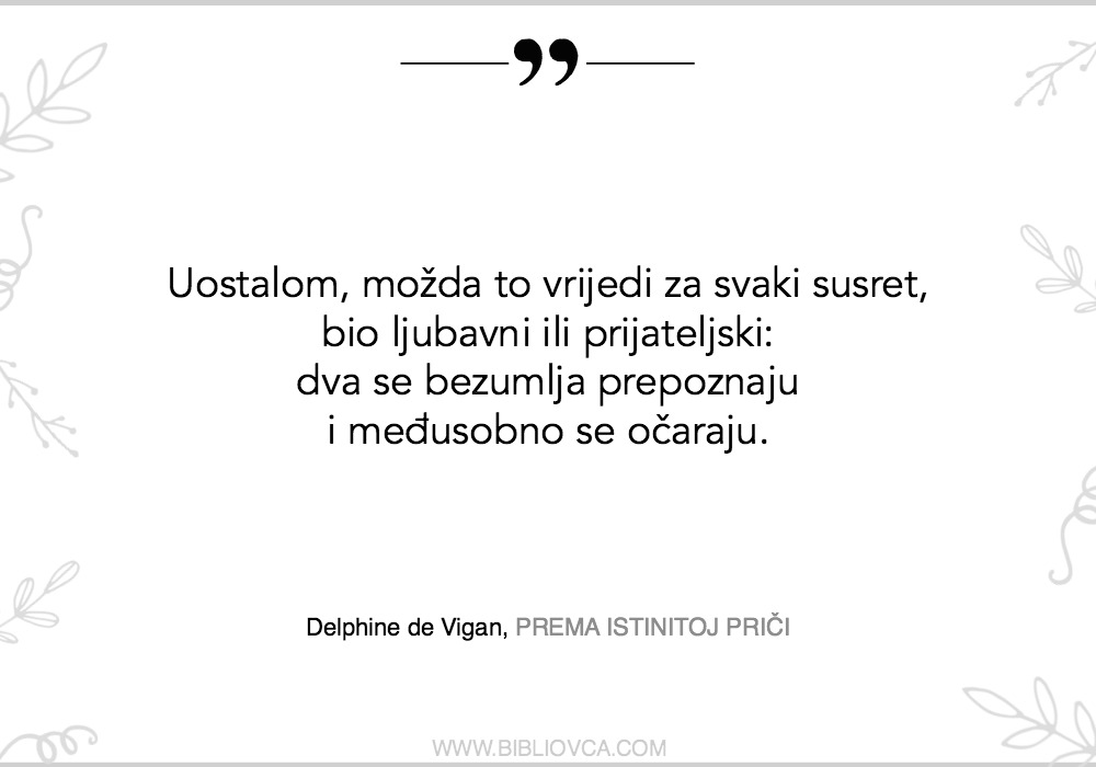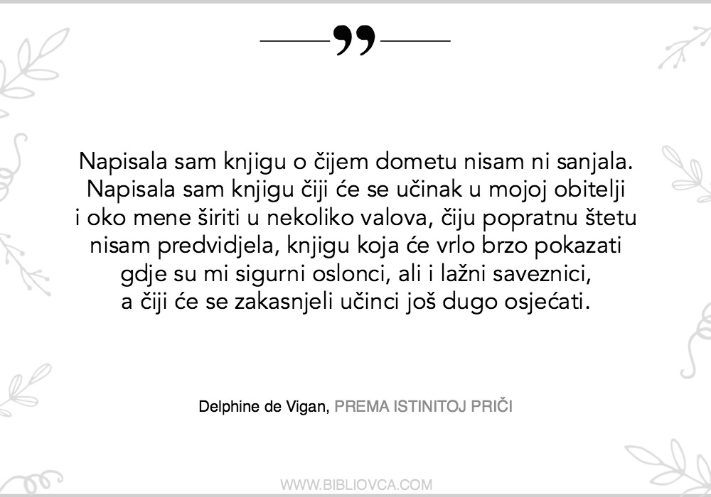 Pročitajte i saznajte sami – “Prema istinitoj priči” autorice Delphine de Vigan (koju je za nakladničku kuću Oceanmore fenomenalno prevela Vlatka Valentić) jedan je od najboljih romana koje sam pročitala 2018. godine. Znam da sam, čim sam dovršila čitanje, na Facebook stranicin napisala samo: “Ovo je nešto najbolje što ćete pročitati ove godine. Ne čekajte moju recenziju, ne čekajte ičiju recenziju, čitajte ovo.”