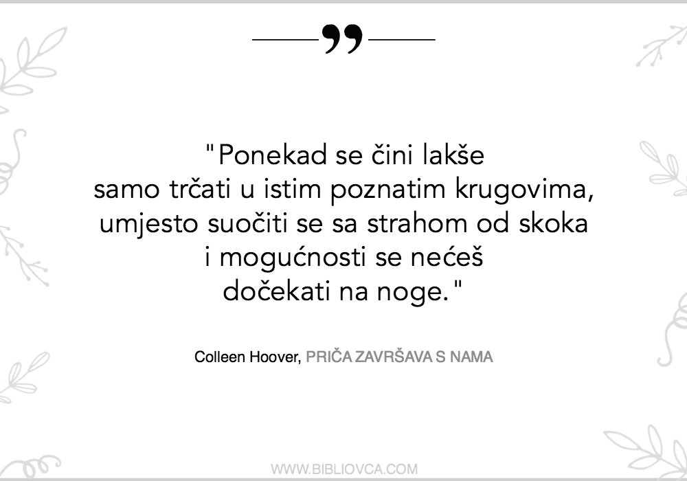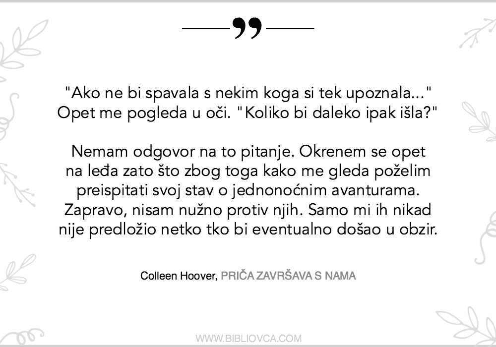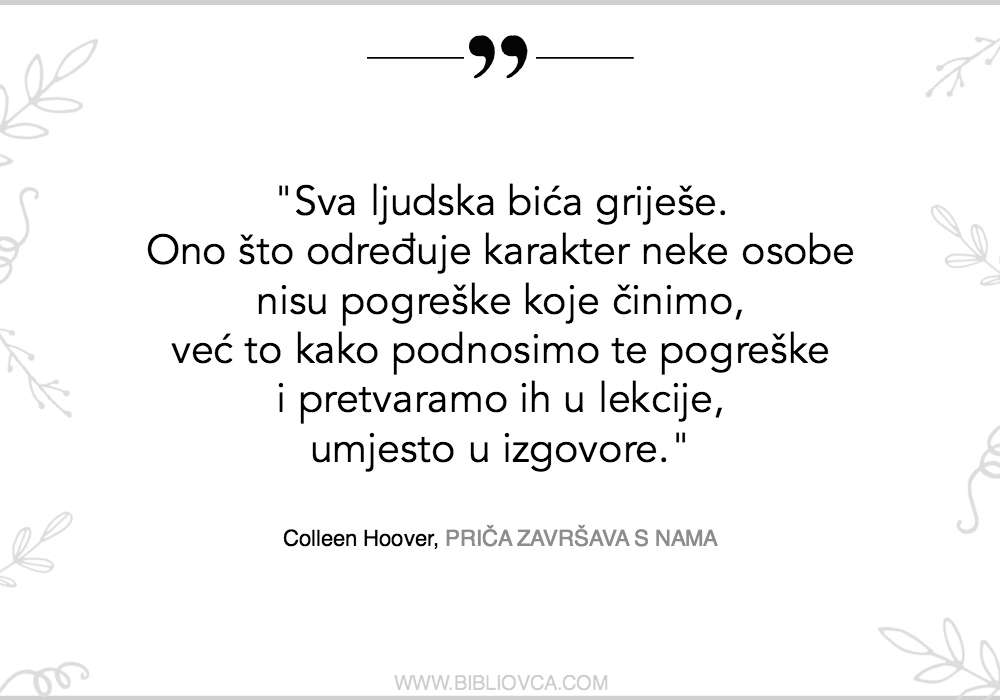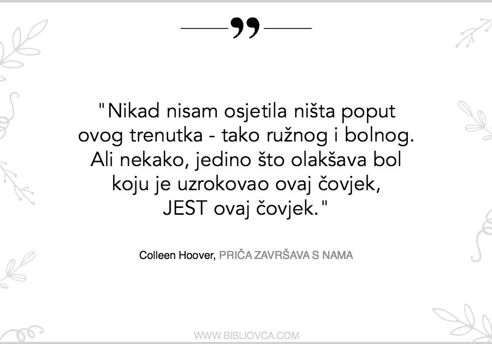 No, Colleen Hoover očito ima dobar osjećaj za mjeru i zna kako ljubiteljima ljubavnih romana dati baš ono što traže i zbog čega ih čitaju, a istovremeno ne udaviti nas ostale. Mene je kupio humor, a i kupila me je ona druga priča iz Lilyine prošlosti, ona o neobičnoj, nezaboravnoj prvoj ljubavi koja naprosto nije mogla propupati u okolnostima u kojima se začela…