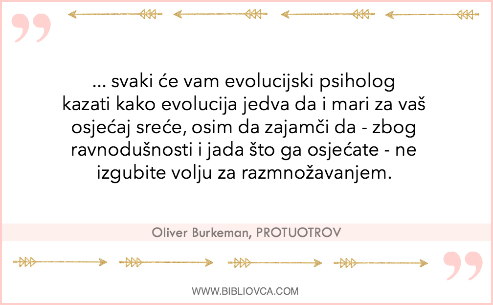“… kako bismo mogli biti istinski sretni, moramo možda biti spremni iskusiti daleko negativnije osjećaje – ili, u najmanju ruku, naučiti da prestanemo stalno i bjesomučno bježati od te vrste osjećaja. Posrijedi je zbunjujuća misao, i to misao što dovodi u sumnju ne samo naše metode postizanja sreće, već i odrednice na kojima temeljimo značenje pojma ‘sreća’.”