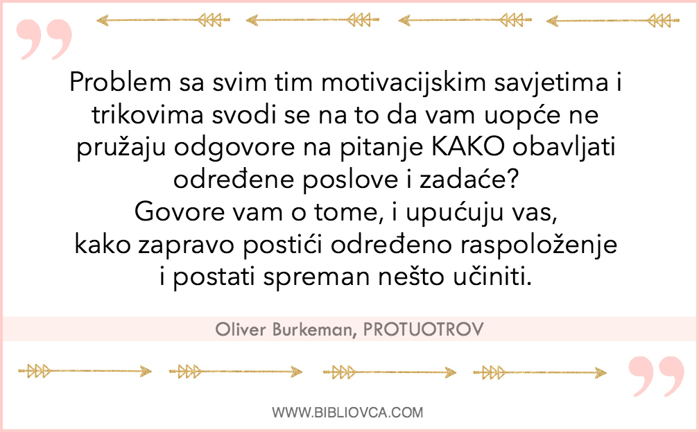 Neke od drugih zabluda s kojima se Oliver Burkeman upušta u obračun su i ove; motivacija je temeljno, neizbježno stanje koje mora biti stalno prisutno kako bismo uopće išta bili u stanju napraviti; pozitivno razmišljanje i vizualizacija će pomoći da ono za čime žudimo što prije pronađe put do nas (kao da bi itko od nas htio nekakvu mutavu, poluslijepu sreću koja, k’o matora mazga, nikako da nas pronađe); postavljanje ciljeva, podciljeva, radnih ciljeva, petogodišnjih ciljeva, tematski podijeljenih ciljeva i grčevito ustrajanje u ostvarivanju istih je jedini put do uspjeha; neuspjeh je strašna, ali zaslužena sudbina lijenih ljudi i ne smije biti sastavni dio jednog sretnog života.