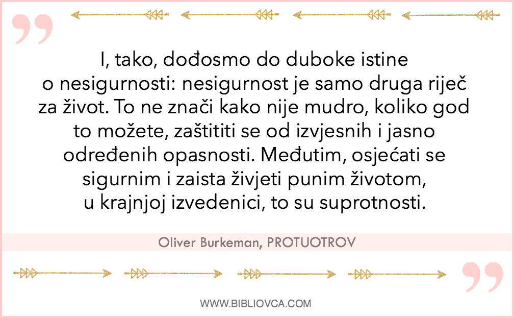 Dajte priliku Oliveru Burkemanu da vam kaže što želi – ima puno toga pametnoga za reći. Zbog tog svog, kako ga autor zove, “negativističkog” (ima autor svoju definiciju ovog pojma koja malo odstupa od originalne) pogleda na svijet, ova knjiga je, otkad je stigla na moju policu, vratila svježinu u moja razmišljanja.