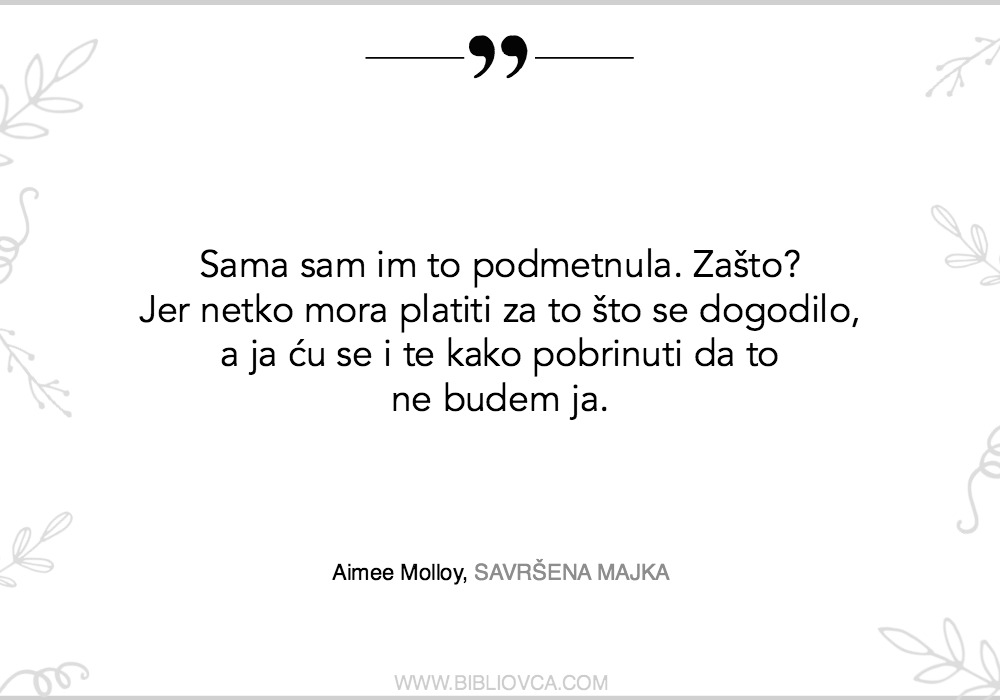 Ana Jembrek je na svom blogu “Knjige su moj svijet” napisala nešto s čime se slažem – autorica je, želeći valjda pobuditi brzu empatiju čitateljica prema svojim likovima (kojih ima malo previše za moj ukus, kad su ovakve knjige u pitanju), odlučila dotaknuti sve bolne točke suvremenih majki; od srama do krivnje; od narušene slike o vlastitom tijelu, pa nedostižnih očekivanja po pitanju zadovoljavanja ranih djetetovih potreba.