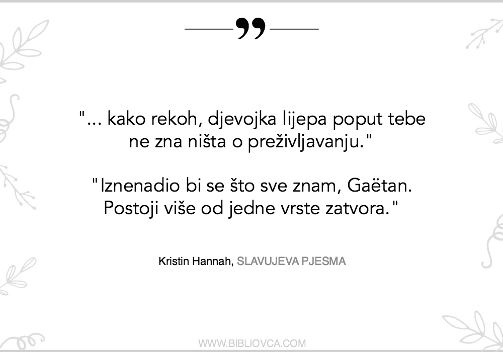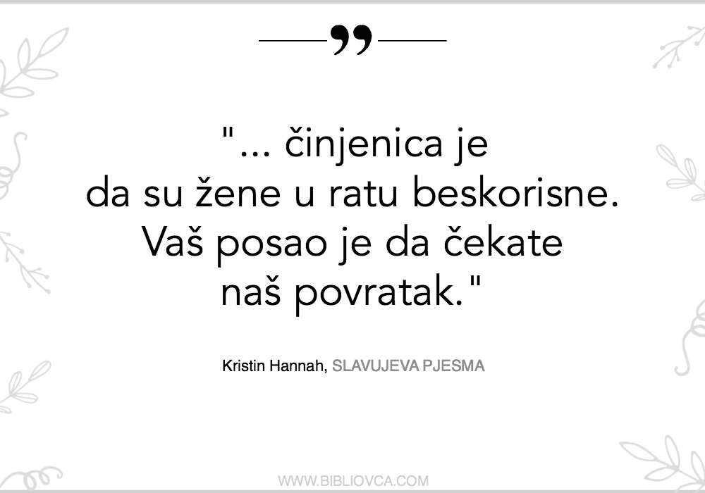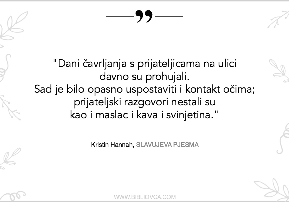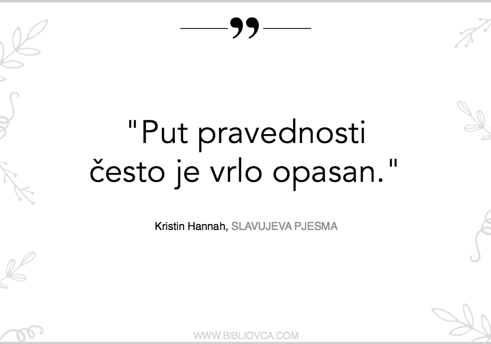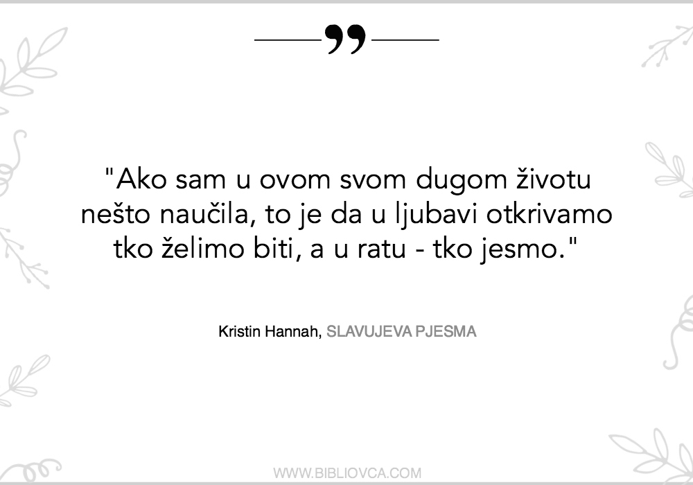 Moram vam povjeriti nešto potencijalno sramotno. Ovo je, naime, moja prva Kristin Hannah. Istovremeno sam ekstatična zbog činjenice da je Slavujeva pjesma prva njezina knjiga koju sam čitala i šokirana samom sobom što sam je do sada zaobilazila. Moram za to okriviti naslovnice sa krijesnicama i ružičastim zalascima sunca. Nije nešto za čime posežem odmah. Morate mi oprostiti. Dovoljno sam kažnjena time što prije nisam čitala ništa njezino. 🙂