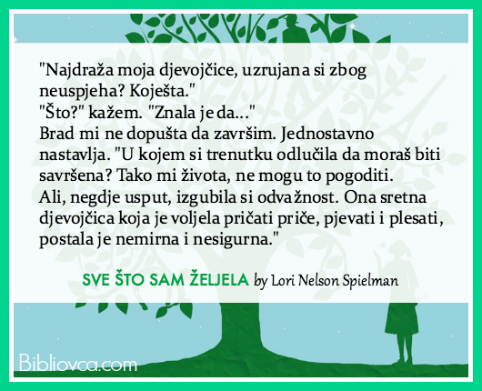 Iznenadila sam se koliko me je brzo okupirala i koliko brzo sam dobrovoljno zauzela mjesto među onima koji navijaju za Brett i ne žele ni trepnuti dok ne vide kako će se priča rasplesti. Iznenadila sam se koliko vješto je autorica iskombinirala složene i napete događaje iz prošlosti i sadašnjosti sa jednim pitkim stilom. Upravo zbog toga se autoricu, mislim, uspoređuje sa Jojo Moyes i Ceceliom Ahern. Kako sam nedavno upoznala ove tri autorice, i kako su mi valjda dojmovi o svakoj još svježi, mogu posvjedočiti da je Lori Nelson Spielman siguran, ali ne i monoton, izbor za ljubitelje Moyes-Ahern literature. 🙂