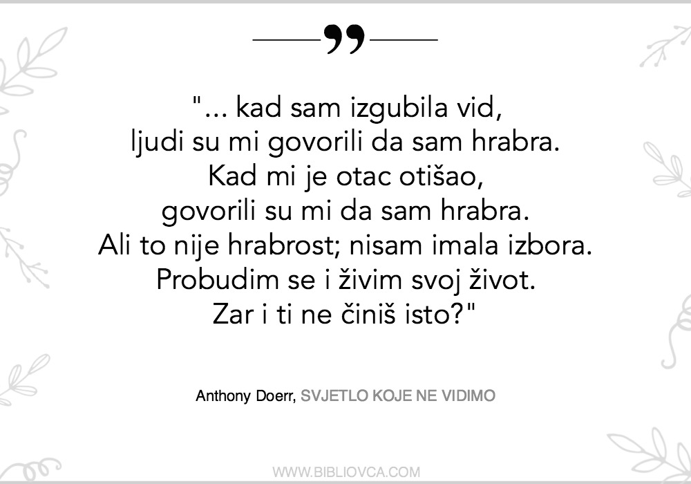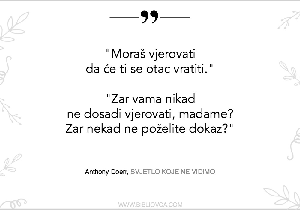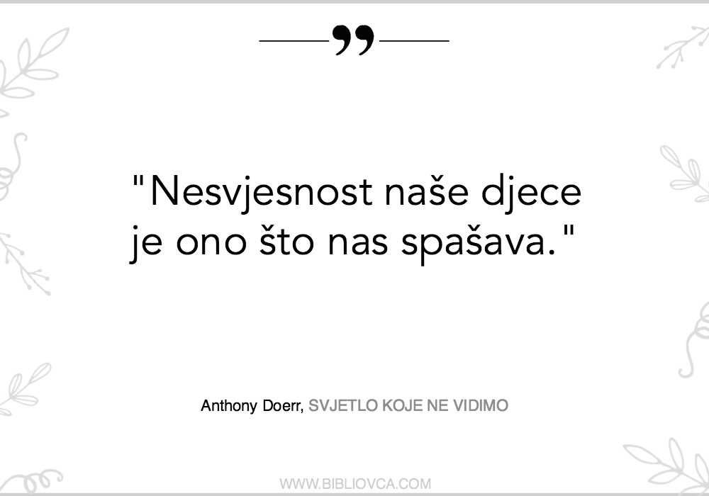Također, obratite pažnju na jednu zanimljivu stvar. Marie-Laure je slijepa. No, njezina poglavlja toliko su puna detalja – nevizualnih detalja – da uopće ne primjećujemo da njezinom svijetu nešto nedostaje! Ne primjećujemo da dok čitamo ni mi, zapravo, ne vidimo! TO je ono što je njezin otac učinio za nju, a autor nam je tako vješto dao da iskusimo! “Svjetlo koje ne vidimo” je tako dobro, tako pametno odabran naslov.