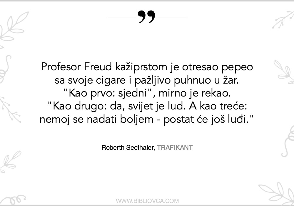 I to se tako lijepo vidi upravo zato što je Seethaler kao njegovog sugovornika podmetnuo mladog, iskrenog, neiskvarenog Franza Huchela; razgovori između ovo dvoje ljudi stoga nisu zamorno intelektualni. Mnogi autori bi, vjerujem, izmišljajući nekog svog Freuda dali sve od sebe da taj Freud zvuči jako pametno i da čitatelja davi što raznim psihoanalitičkim terminima, što svojim kompliciranim shvaćanjima složenih bolesti od koje svijet počinje bolovati.