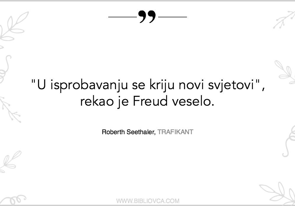 Gospodina Freuda sam do sada najčešće susretala u psihologijskim udžbenicima za vrijeme studija; mislim da je ovo možda čak i prvi put da ga susrećem ovako oživljenog u nečijoj tuđoj priči. O njemu sam uvijek čitala kao o centralnoj figuri i pokretaču jedne psihoterapijske škole i uvijek sam čitala o njegovom usponu; ovo je također prvi put da o njemu čitam kao sporednom liku, da ga na neki način gledam izvana, i to još u razdoblju svojevrsnog pada, odlaska, progona, obacivanja.