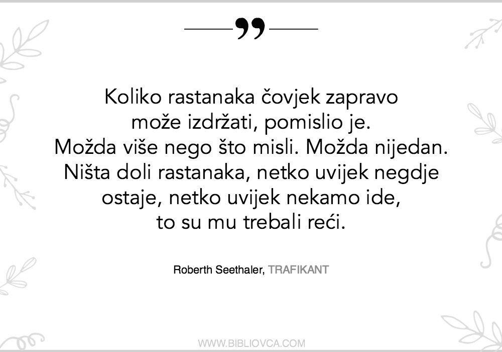 Robert Seethaler mu je još darovao vrlo dopadljivu (barem meni) osobnost; malo dostojanstvene rezerviranosti, malo crnog humora i puno trezvenosti. Pokazao nam je čovjeka koji je čitavoga života slušao tolike izvrnute i oštećene verzije nečije stvarnosti, nečije prošlosti, a pred onom s kojom se u knjizi suočavao je, zapravo, ostao bez teksta, pomalo izgubljen u tjeskobi i nevjerici.