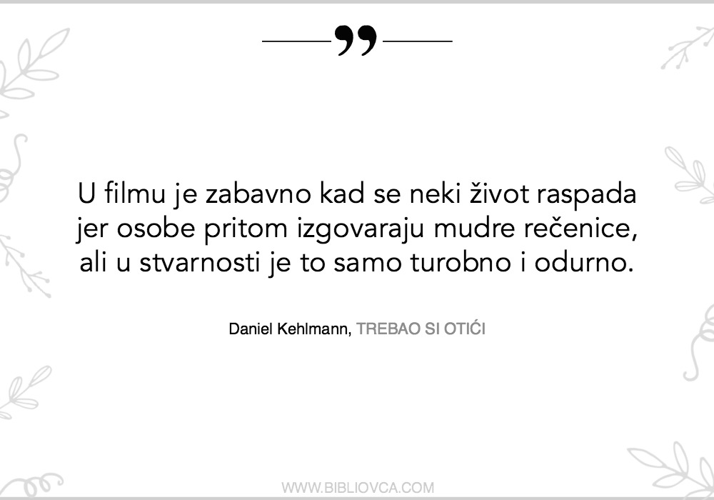 Gospodine Kehlmann, sad bih najradije povela 30 svojih prijatelja i rasporedila ih u svaki kut kuće, pa neka njih guta… Ili što već ta čudovišna kuća radi. I ne, ne bih povela dijete, bila bih pametnija, puno pametnija.