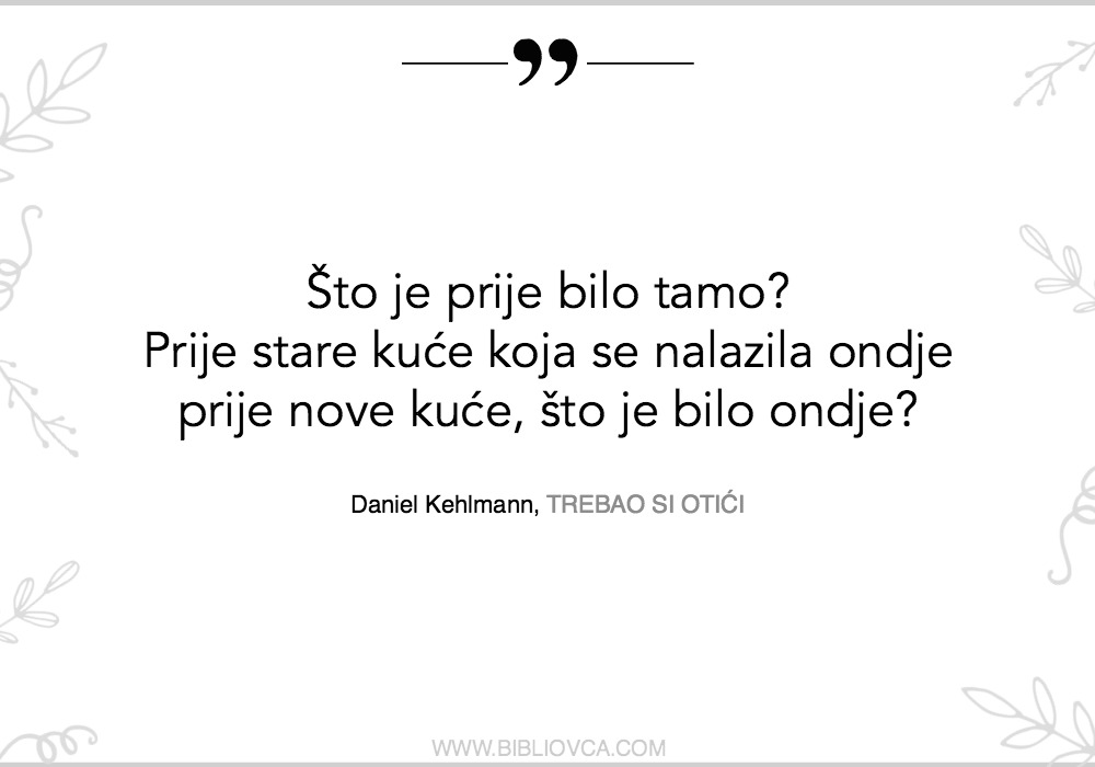Ali, gospodine Kehlmann, ne volim ove neke kuće u kojima i kad nema žive duše, nekog ili nečeg ima, i to nešto se uglavnom pojavi na baby-monitoru dok moje dijete spava, a ja sam u drugoj sobi… Isto tako ne volim kuće u kojima nekog ima, očito nekog ima, a ne znam točno GDJE, pobogu… Ili možda, KADA, pobogu…