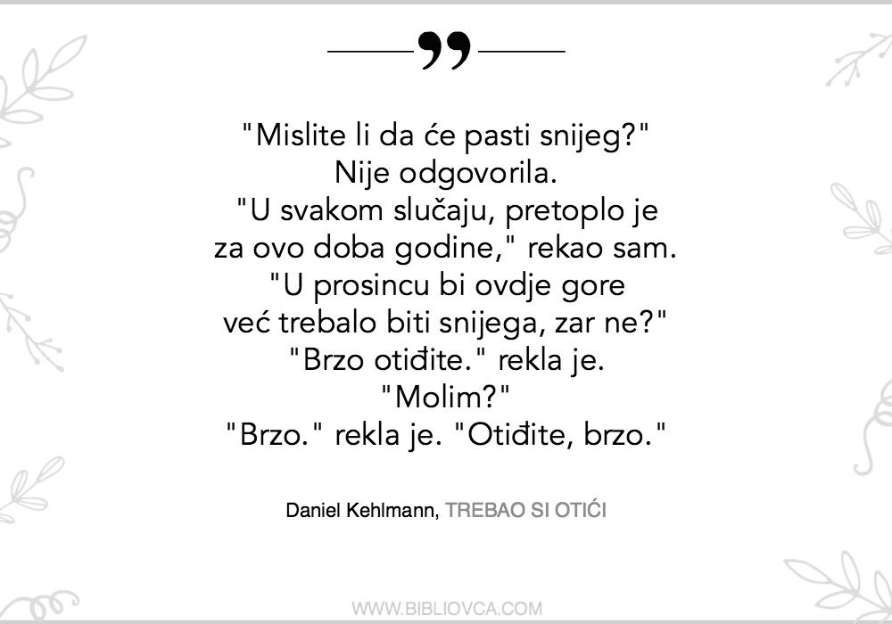Čitala sam ja puno Stephena Kinga u svoje vrijeme, gospodine Kehlmann, znam ja kako to ide i što se sve događa. Već sam ja viđala kako završe ti neki pisci koji se osame u raznoraznim kućicama u planinama ili pored jezera… Nisam pisac, velite, pa se nemam čega bojati? Ne budite drski, gospodine Kehlmann, tko kaže da ništa ne pišem?