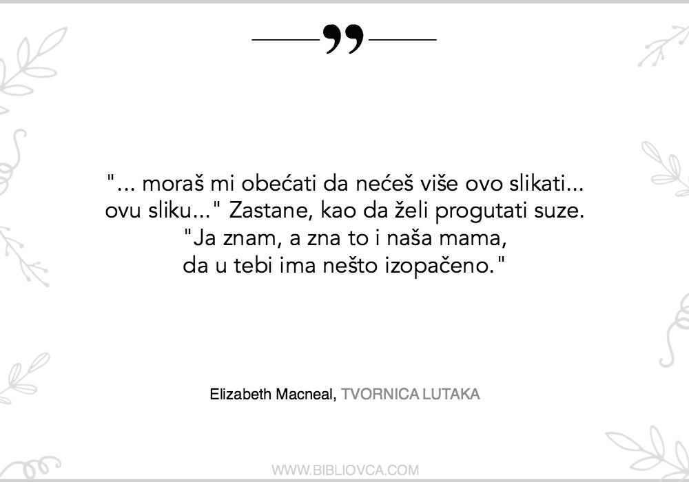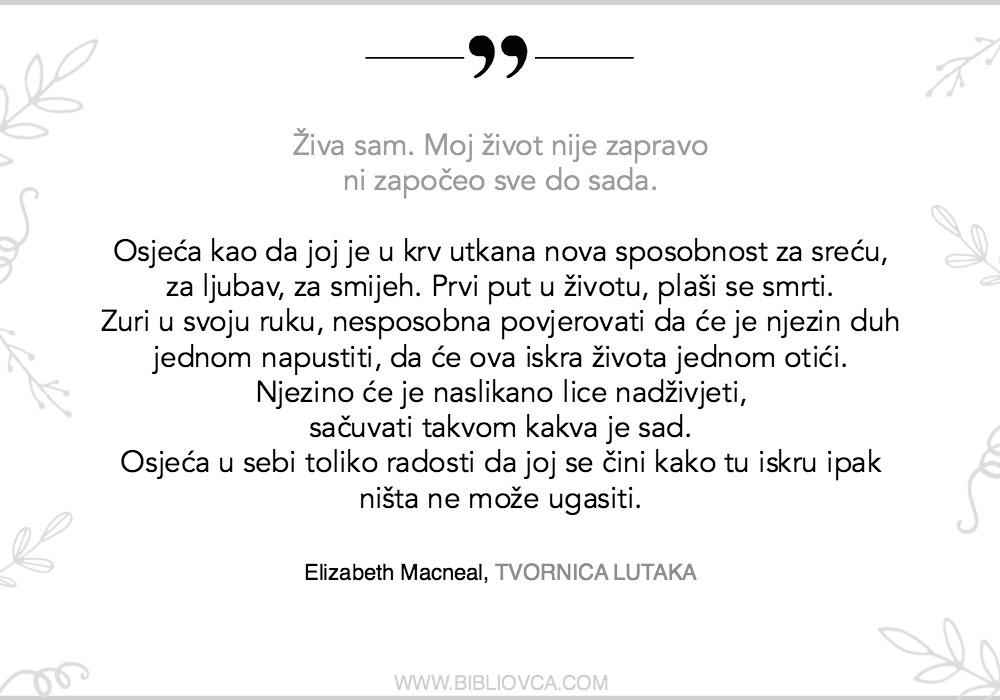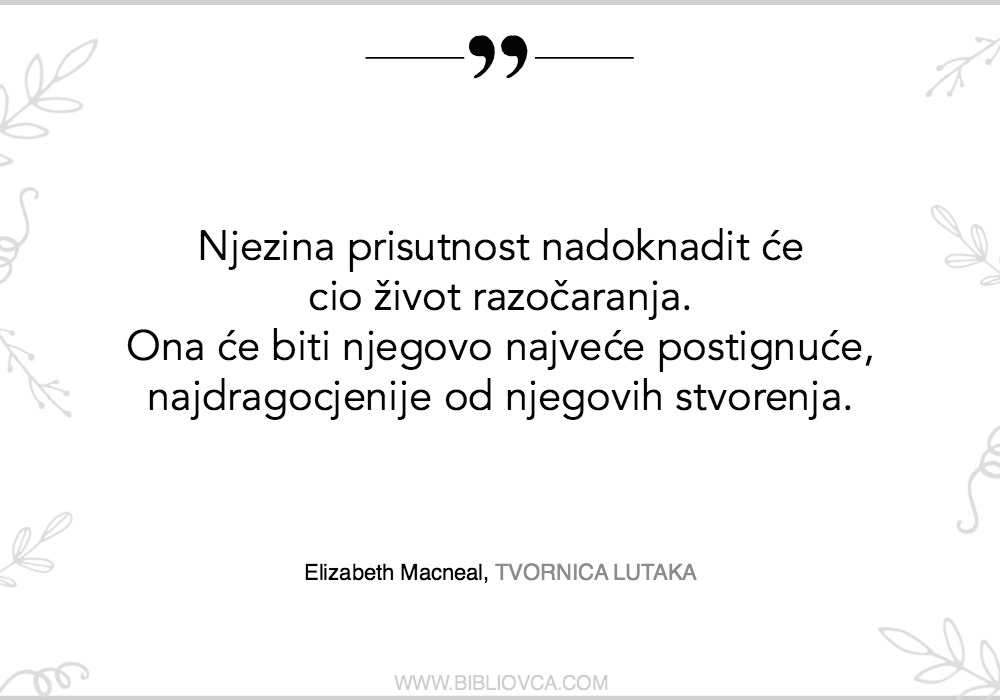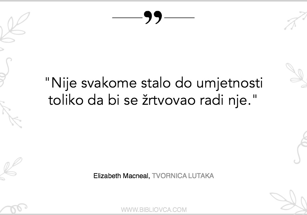 Nije ovo žanr koji inače privlači moju pozornost, ali s ove knjige je nisam mogla skrenuti, nisam mogla zaboraviti kada dolazi na police stranih knjižara jer čitatelji diljem svijeta na svim mogućim društvenim mrežama nisu prestajali brujati o ovom naslovu. I onda je nastalo jedno kratko zatišje – valjda su ljudi tiho bdjeli dan i noć kako bi pročitali “Tvornicu lutaka” dok su joj korice još bile tople od tiskarskih strojeva. 🙂 Nakon toga samo se počela valjati lavina oduševljenja pročitanom.